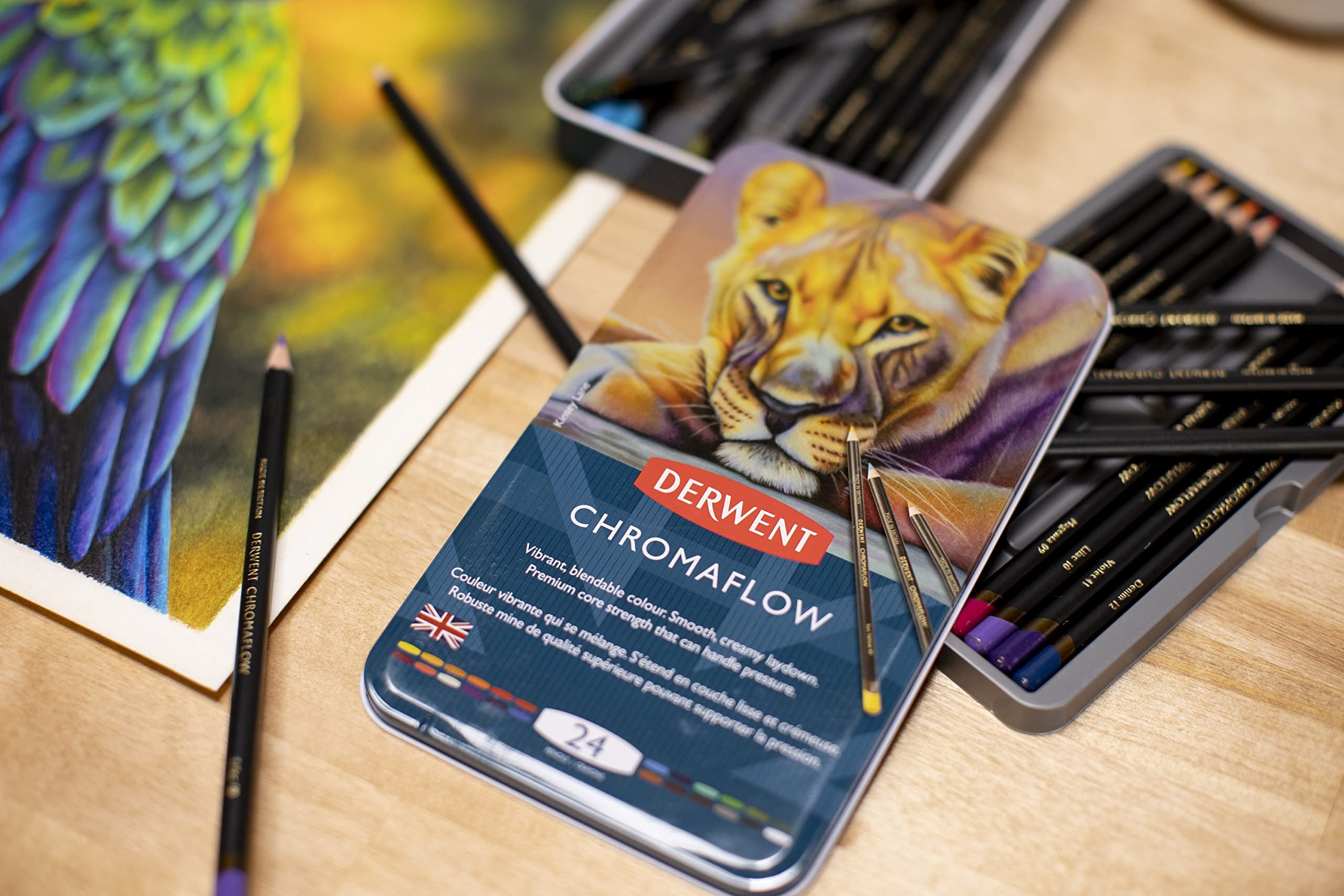 Create your best art with Derwent Chromaflow Color Pencils, formulated with rich pigments to deliver bold, vibrant laydown. Chromaflow Color Pencils have a smooth texture that allows for easy blending and layering, plus premium core strength that can handle pressure when sharpening and in use, minimizing interruptions to your creative flow. As each color pencil is made, glue is applied to the entire length of the pencil slat, keeping the core in place and leading to less breakage. Crafted by Derwent in its UK manufacturing plant, Chromaflow pencils reflect a rich heritage of quality dating back to 1832, with each pencil checked for color accuracy and consistency before leaving the plant. Whether you're coloring, sketching, or free drawing, enjoy beautiful, reliable results from professional artist-quality Chromaflow Color Pencils.