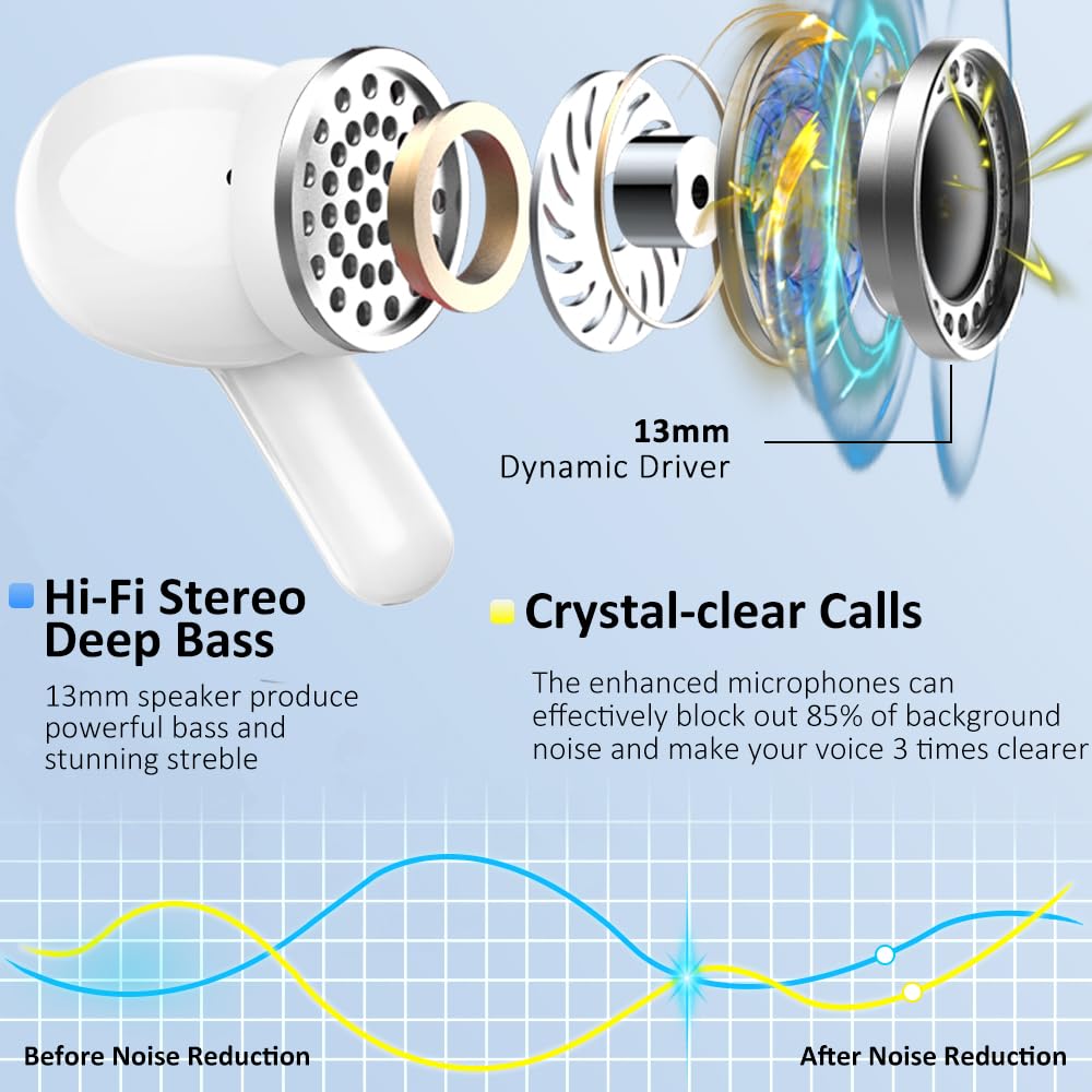 Leading Bluetooth V5.3 Technology and One-Step Auto Pairing: Adopting advanced Bluetooth 5.3, wireless earbud support HSP HFP A2DP AVRCP, which offer you an unparalleled audio experience with faster transmission speed, stronger connection stability, and longer range of bluetooth. Taken from the charging case, bluetooth headphones will be paired with each other automatically, and just hitting on bluetooth list i13 on your device to connect. In a matter of seconds, you are in euphonic music world.