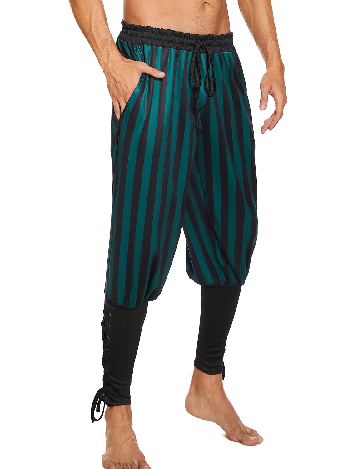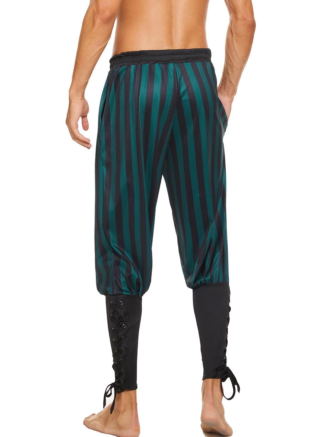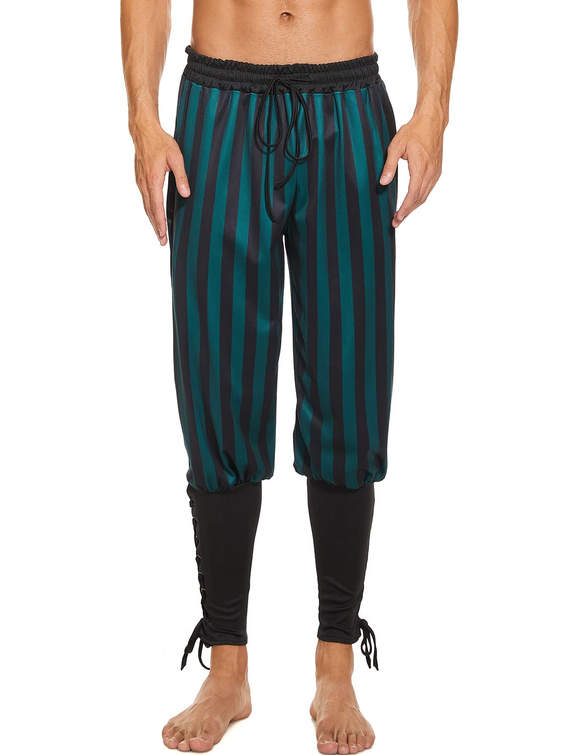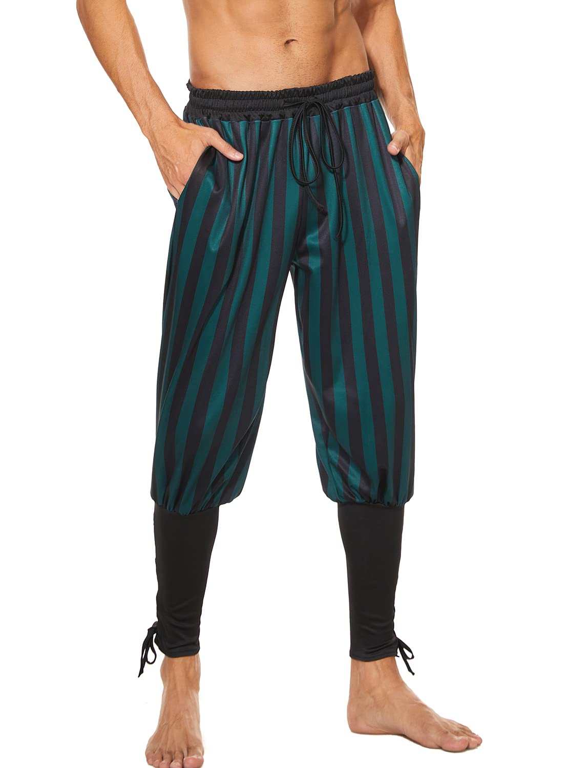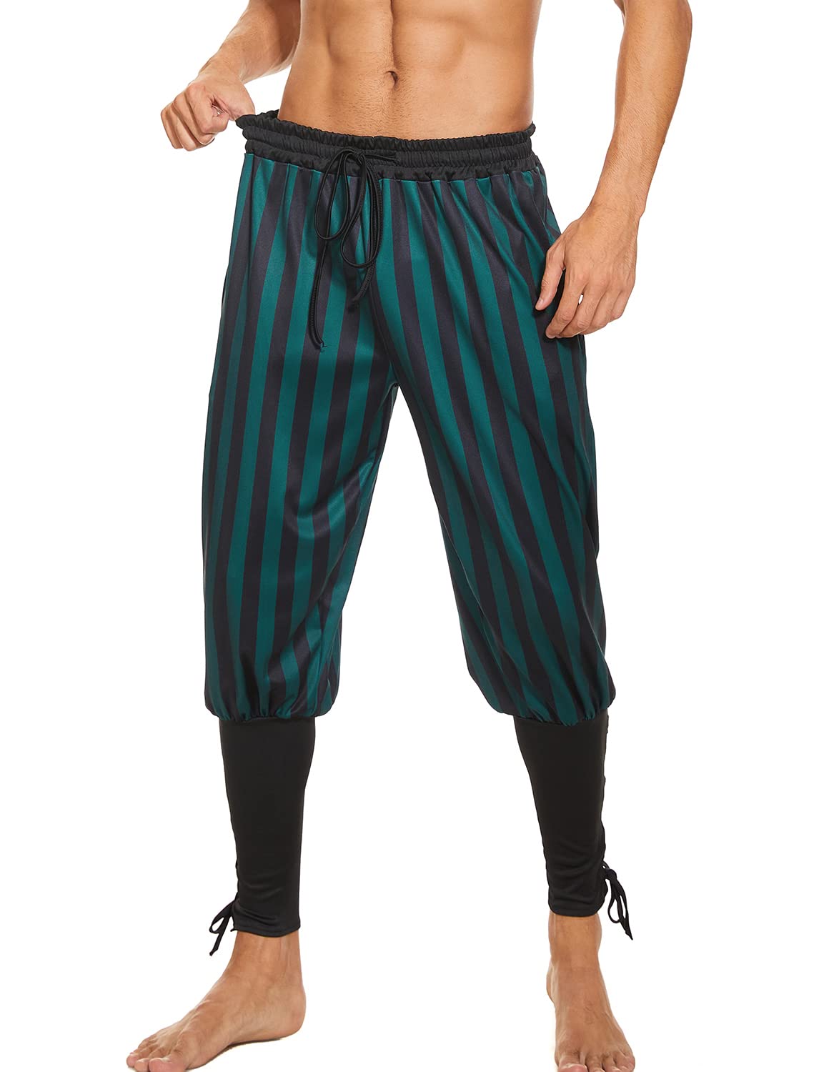 MULTICOLORS: Medieval renaissance style striped pirate pants have varieties of colors can be choosed - Black-Red, Black-White,Black-Green,Black-Brown. The color may slightly different from what it appears on the websites, due to different monitor settings.