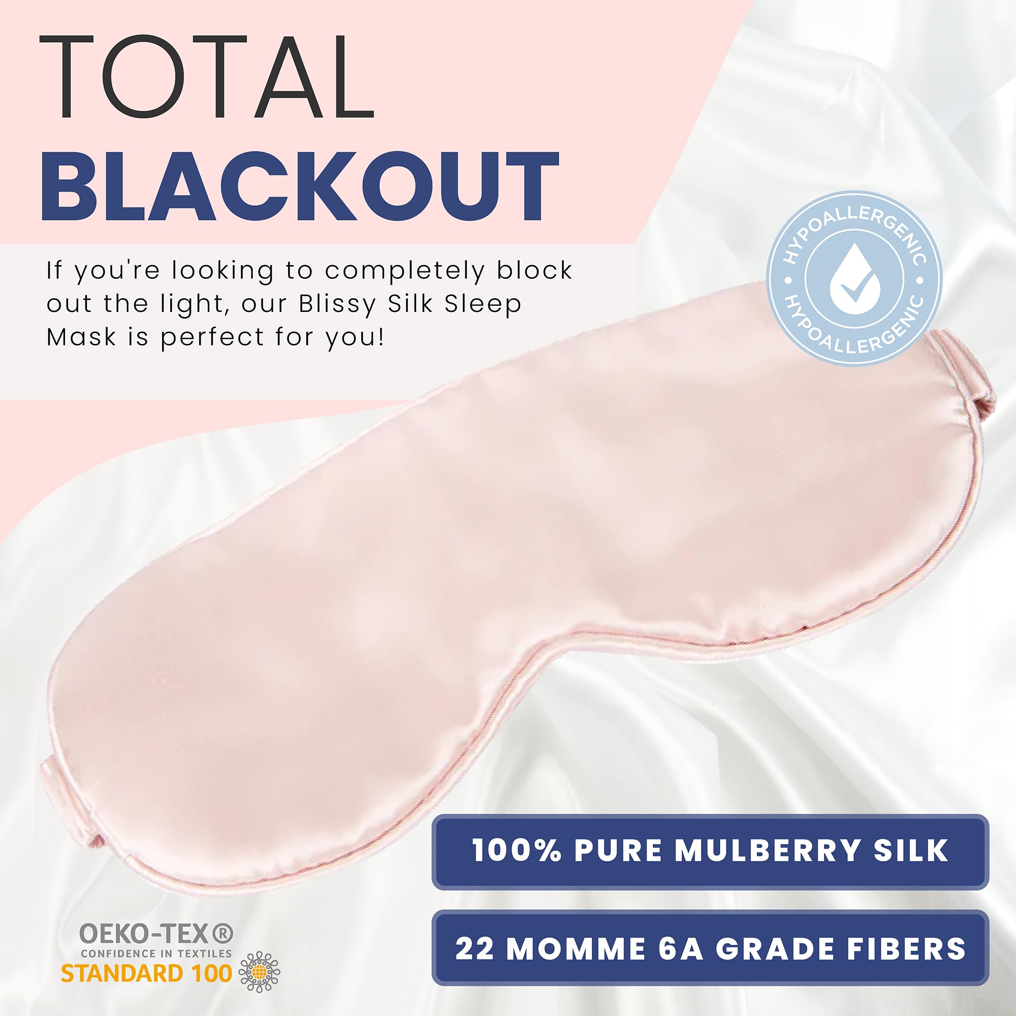 TOTAL BLACKOUT - If you're looking to completely block out the light, our Blissy Silk Sleep Mask is perfect for you! Made with 100% pure Mulberry silk and 22 momme 6A grade fibers, this mask will keep the light out and help you get a good night's sleep.