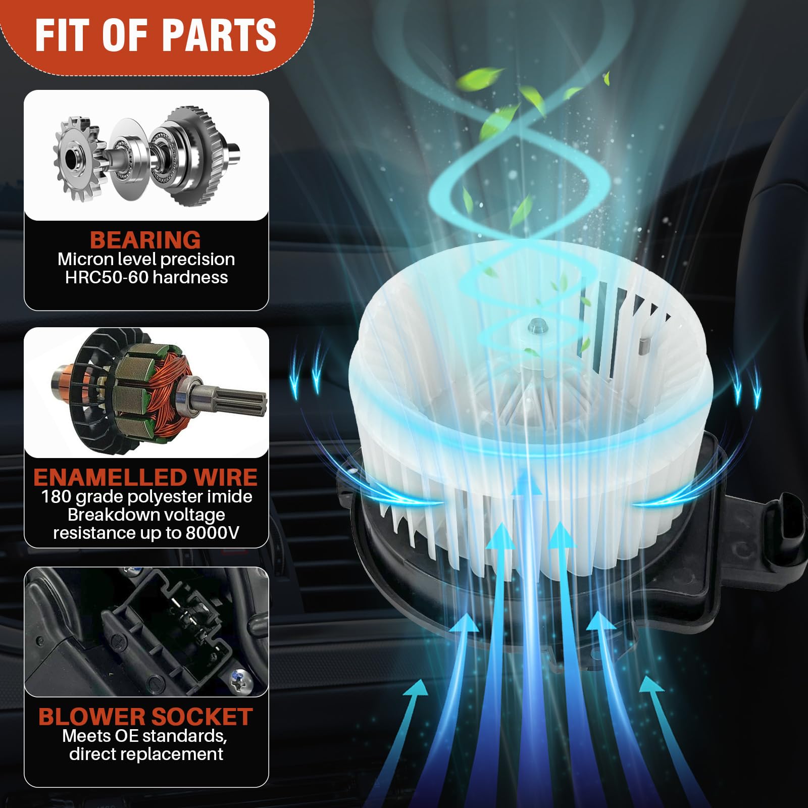 【Function & Maintenance】Blower fan circulates hot/cold air from HVAC system in the vehicle, maintaining thermostat-set temperature. Replace blower motor if vents deliver weak/no airflow or motor runs at low speed
