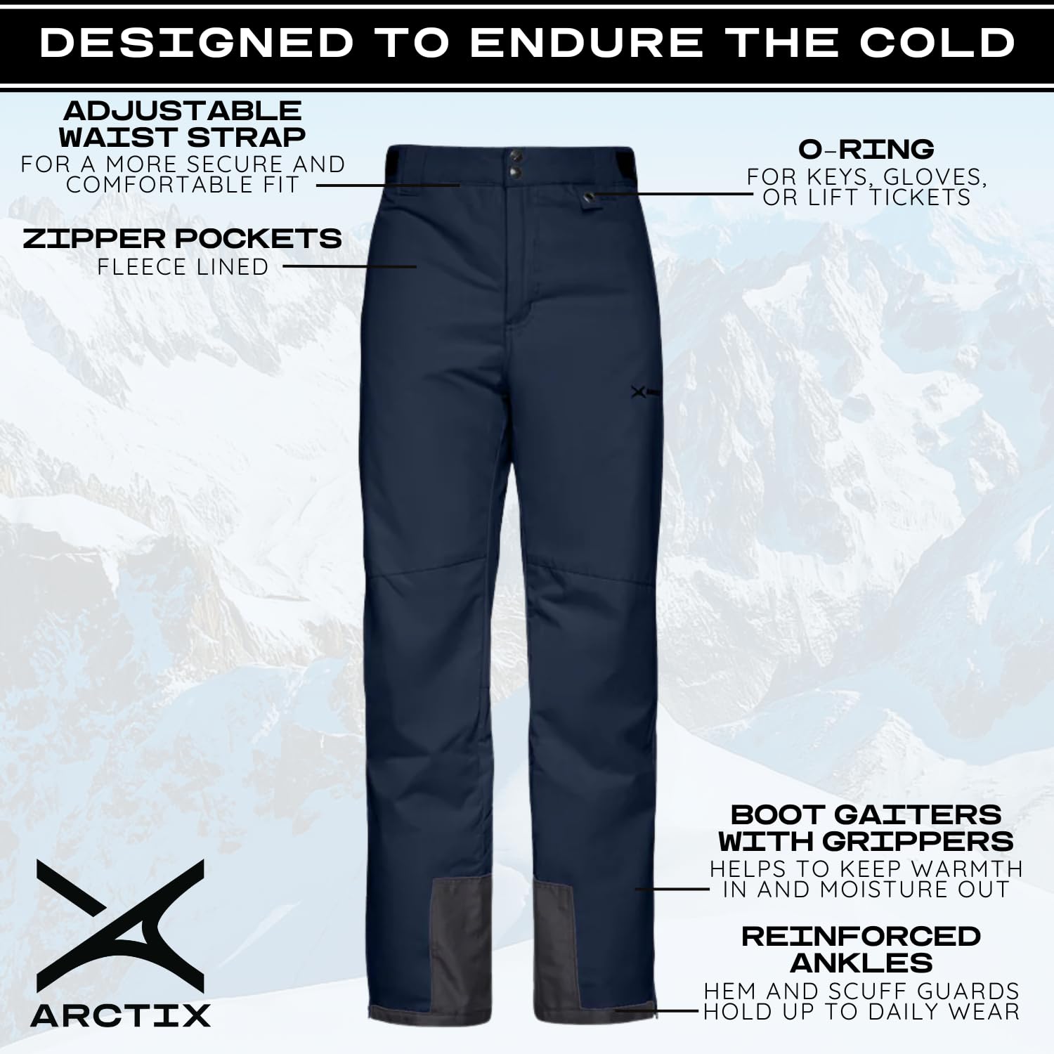 Description Season after season, the 1900 Arctix Men's Essential Snow Pants serve as an outstanding value priced ski/snow pants and a versatile cornerstone of the Arctix line. These pants feature a 100% Polyester Dobby shell with ThermaLock W/R + W/P 3000mm Coating, offering a maximum degree of durability and protection from the elements, while allowing a full range of motion. 85 grams ThermaTech Insulation offers warmth in a lightweight, low bulk garment, keeping you warm at temperatures from -20° to +35° depending on your level of activity. DWR finish (Durable Water Repellent) helps repel water from fabric surface. The adjustable waist ensures a comfortable fit, while boot snaps make them easy for on and off access over boots. Boot gaiters with grippers form a seamless integration with the boots to keep the warmth in, and the moisture out. These relaxed fit pants also include 600 Denier Ballistic reinforced ankle, scuff and hem guards to hold up against daily wear & tear, and conveniently has an O-ring for keys, gloves and/or lift tickets. The pants provide zippered hand warmer style pockets, a zippered fly, and belt loops. They are water and wind resistant, and are machine washable.