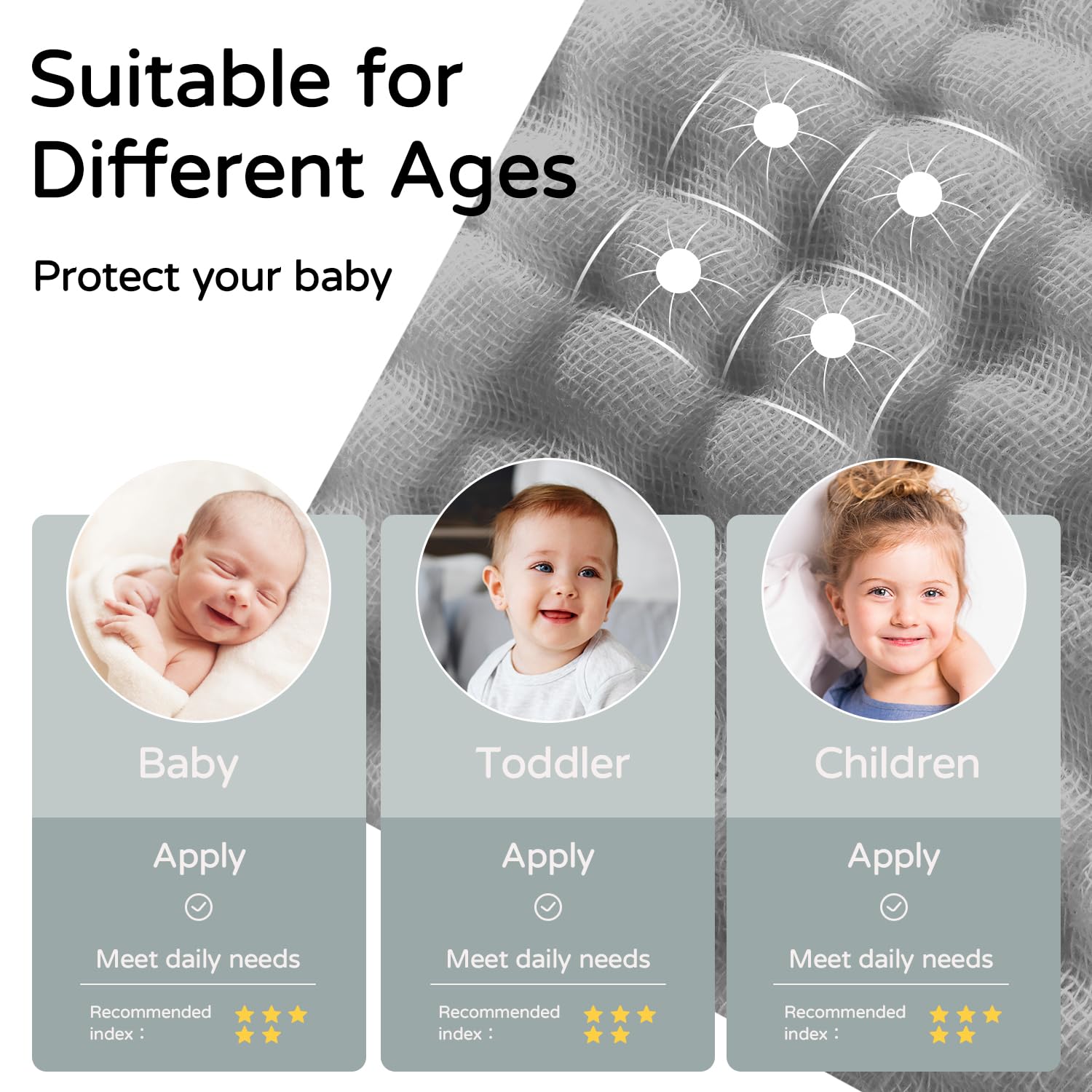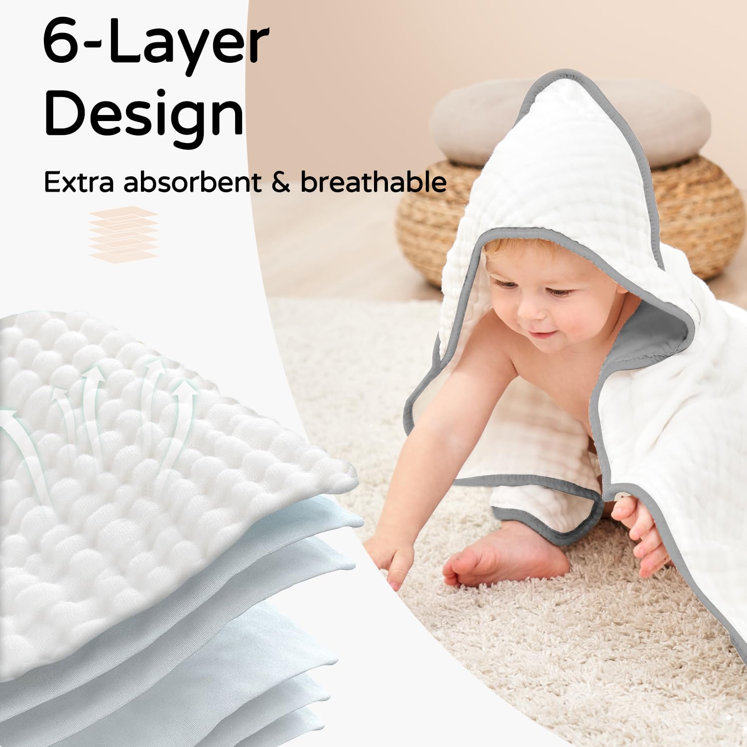 [Excellent Durability] - The 6 layers thickness muslin design is long-lasting enough for everyday use. Sized in 32 x 32 inches, the hooded baby towels are suitable for newborns, infants, toddlers, and small kids up to 3 years old.