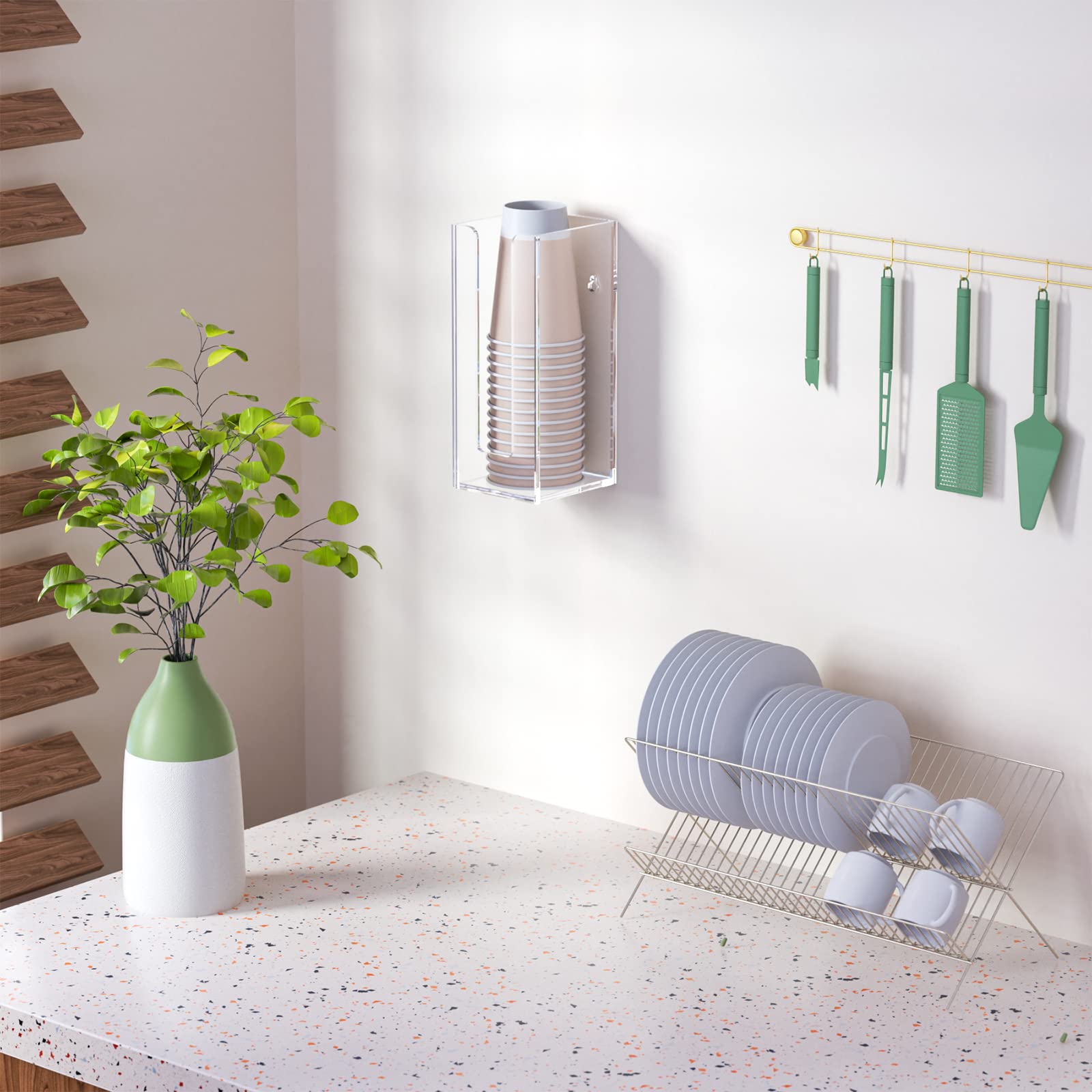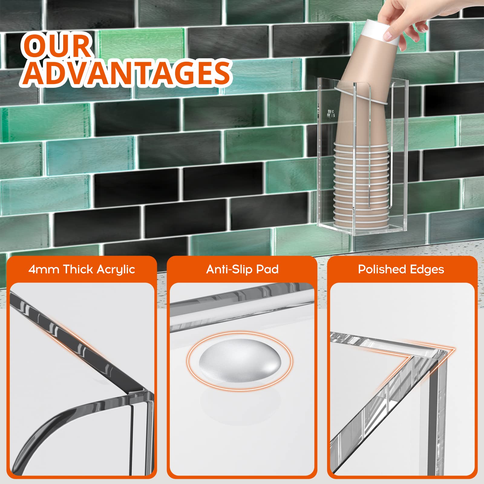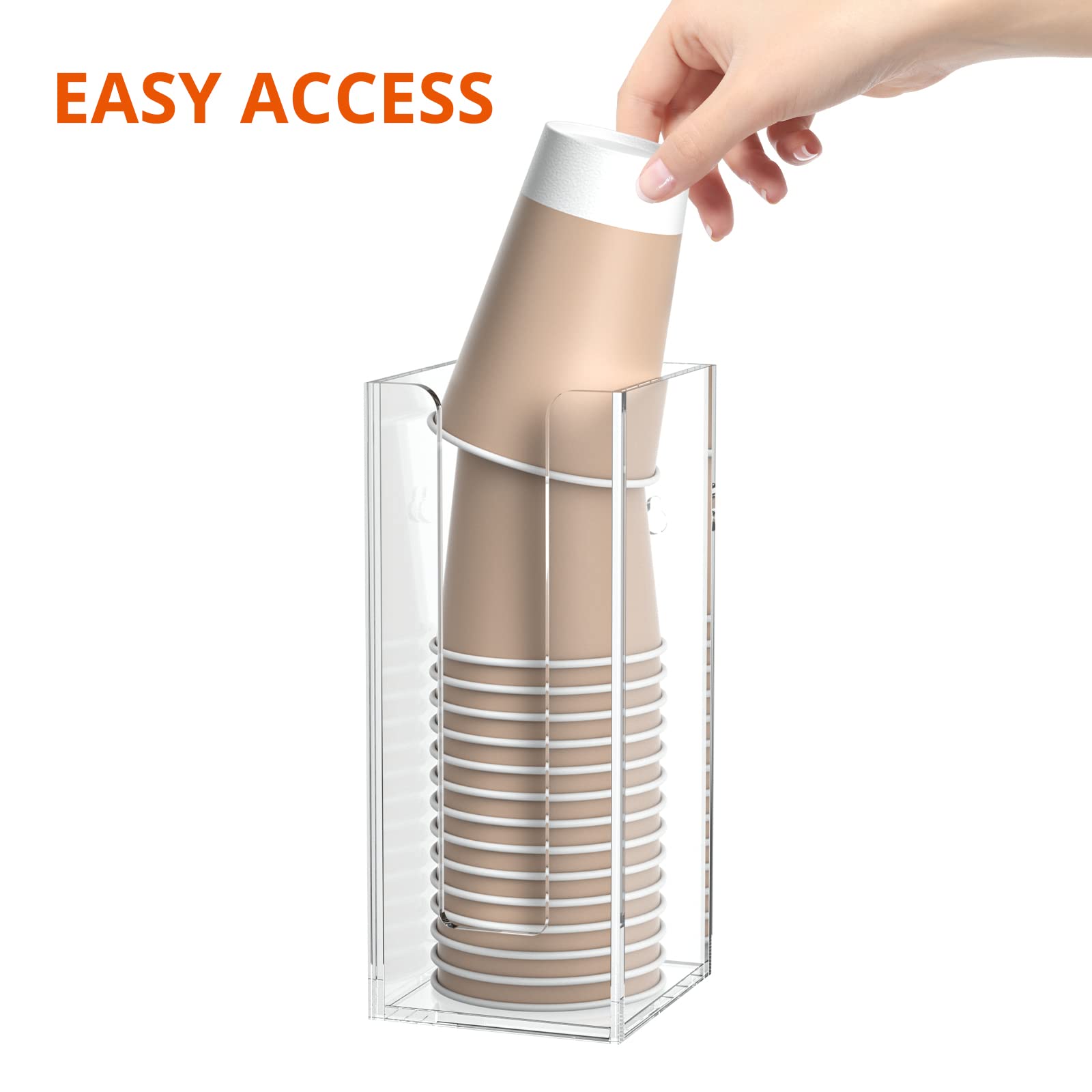 Functional - comes with 2 pre-drilled holes on the back of the acrylic cup dispenser storage organizer, it can be either mounted on wall or placed on countertops of your bathroom, kitchen, office, coffee station.