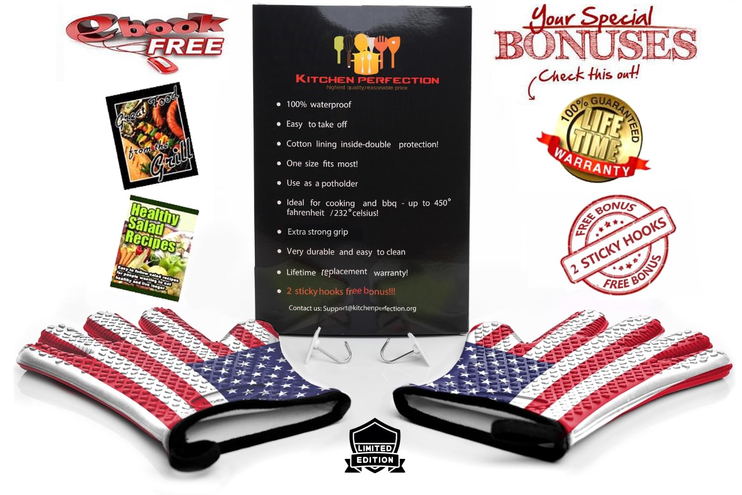 Get Much More 3 Bonuses - We will not let you go without taking from us as much as you can. Get two sticky hangers for comfortable storage and two e-books full of recipes "great food from the grill" and "healthy salad recipes". Having all that, you have the complete set of our silicone oven mitts pair - heat-resistant gloves for being a pro meat smoker, barbeque griller, cook, or baker. Are you still here? Stop wasting your time! Don't settle, this investment makes sense.