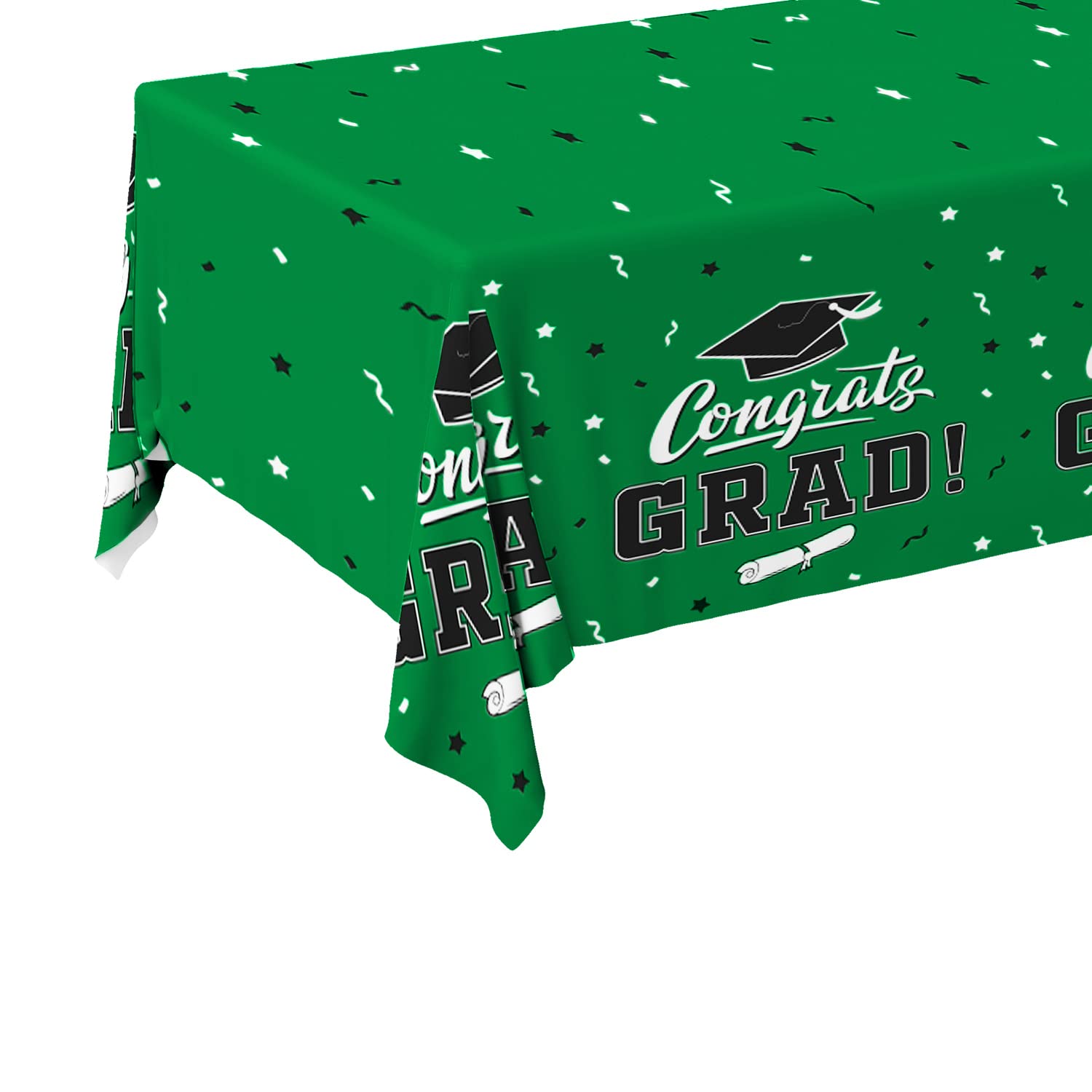 Green background, repeating pattern of mortarboards and "CONGRATS GRAD" , this graduation party tablecover reflect a sense of belonging of school spirit.