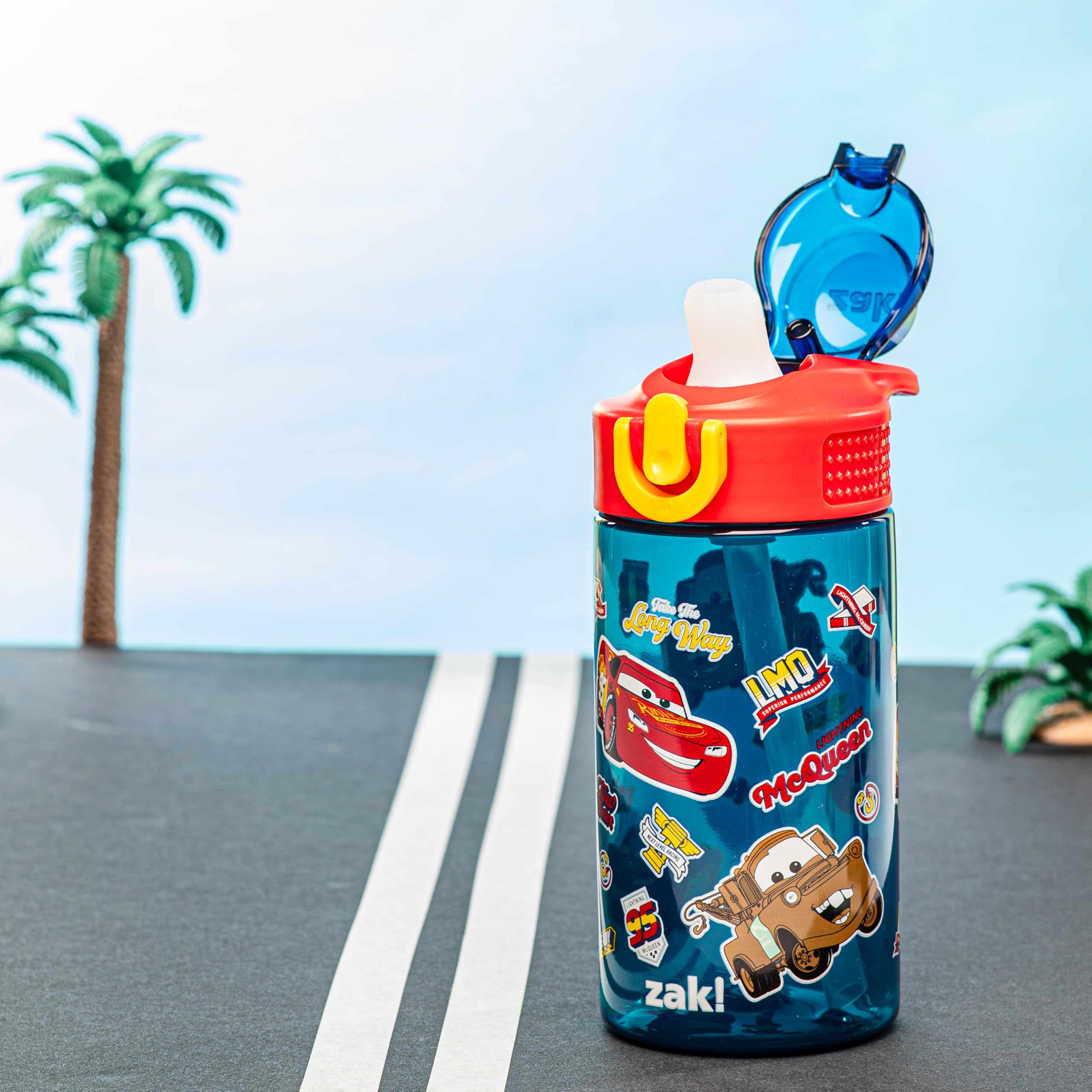 Let kids enjoy hydration with a fun Cars water bottle by zak! designs! Easy to Clean: The silicone spout and straw can be removed from the lid, and the pieces are dishwasher safe for simple cleanup at the end of the day. Reusable and Durable Material: Reusable water bottles will last wash after wash—good news for you and the environment! The 16 oz water bottle is made of PP plastic, durable enough for kids to use every day and bring on any adventure. Leak-Proof Lid: The lid screws on securely and won't leak when the spout is closed, though water flows for easy drinking when the spout is open. The easy-open button has a flip-up lock to keep it from activating accidentally. On the Go: The water bottle has a built-in carrying loop on the lid for easy transportation, and with the spout cover to keep the spout clean and closed, it can be tossed into a bag for worry-free travel. Specifications: 16 oz capacity. Made of durable plastic. Dishwasher safe, do not microwave. Length: 4.33-inch, Width: 2.78-inch, Height: 7-inch. Character: Lightning McQueen and Tow Mater (Disney and Pixar's Cars).