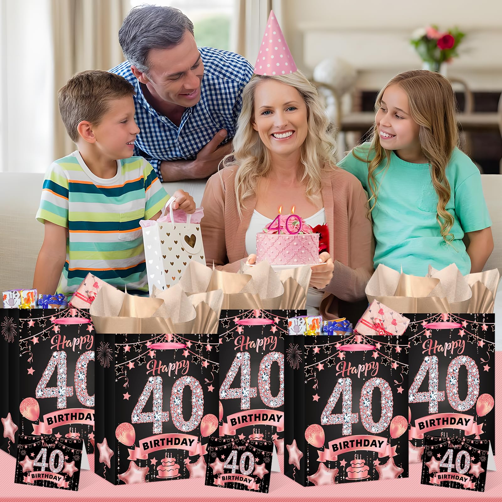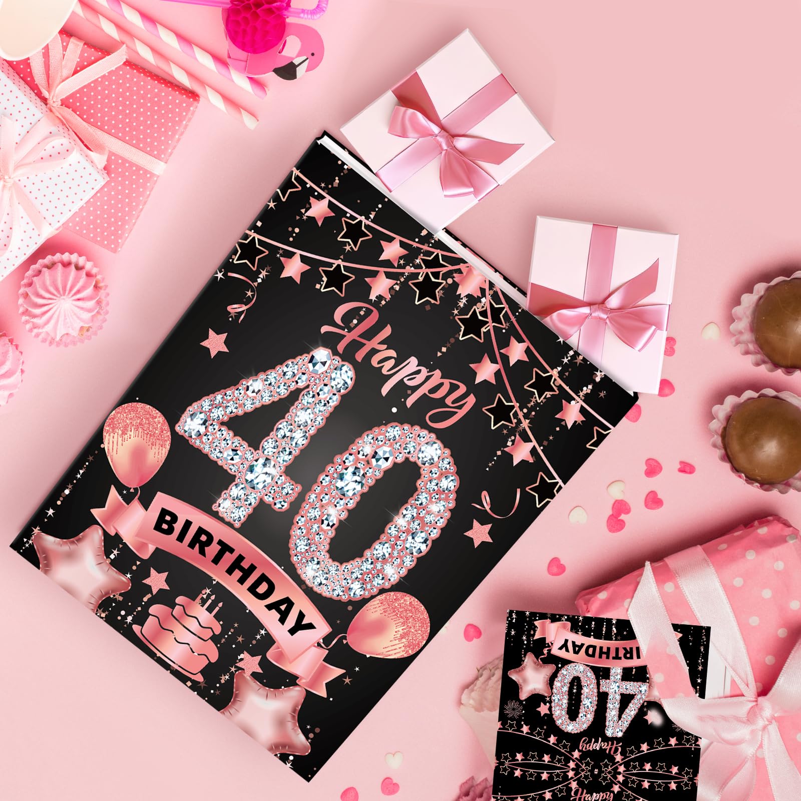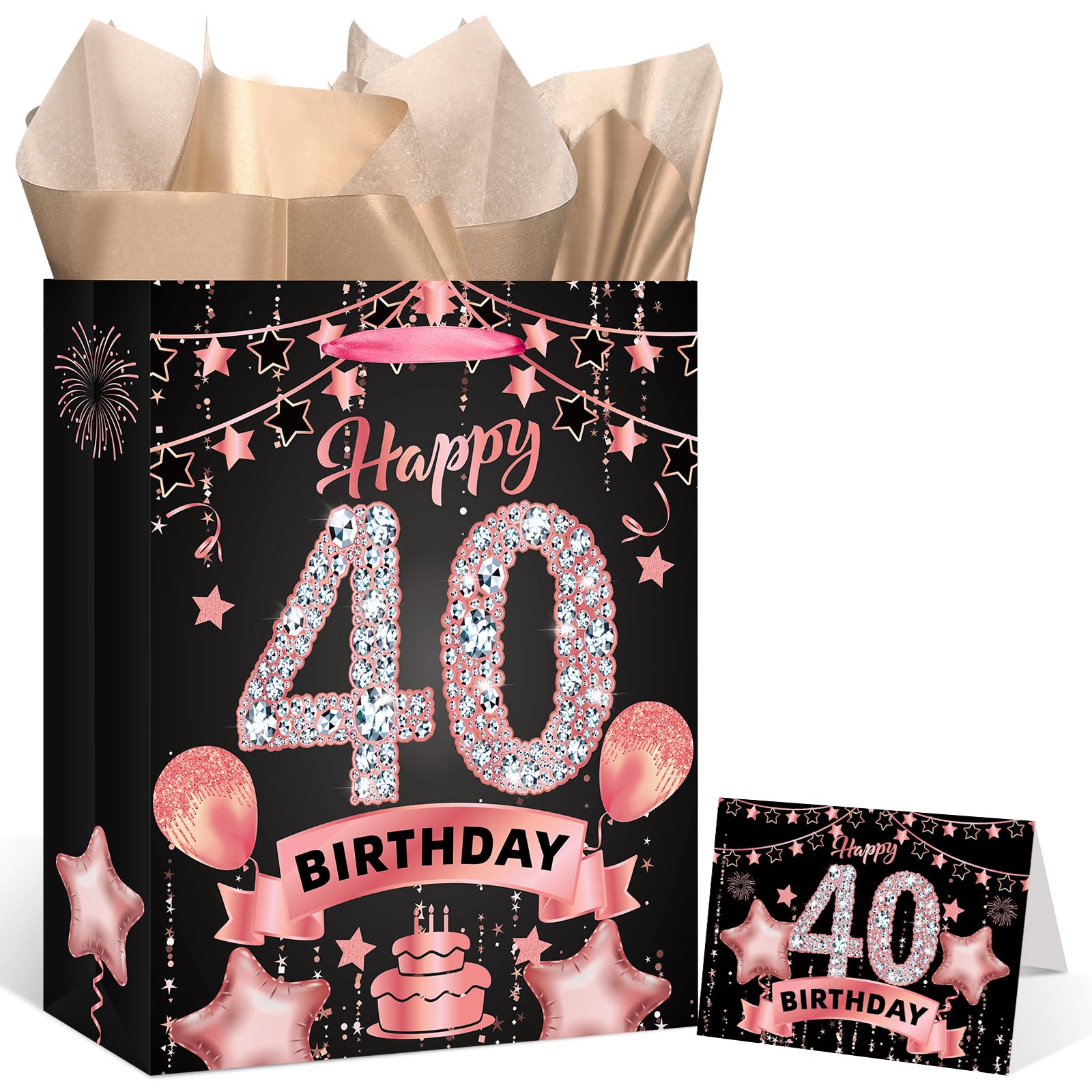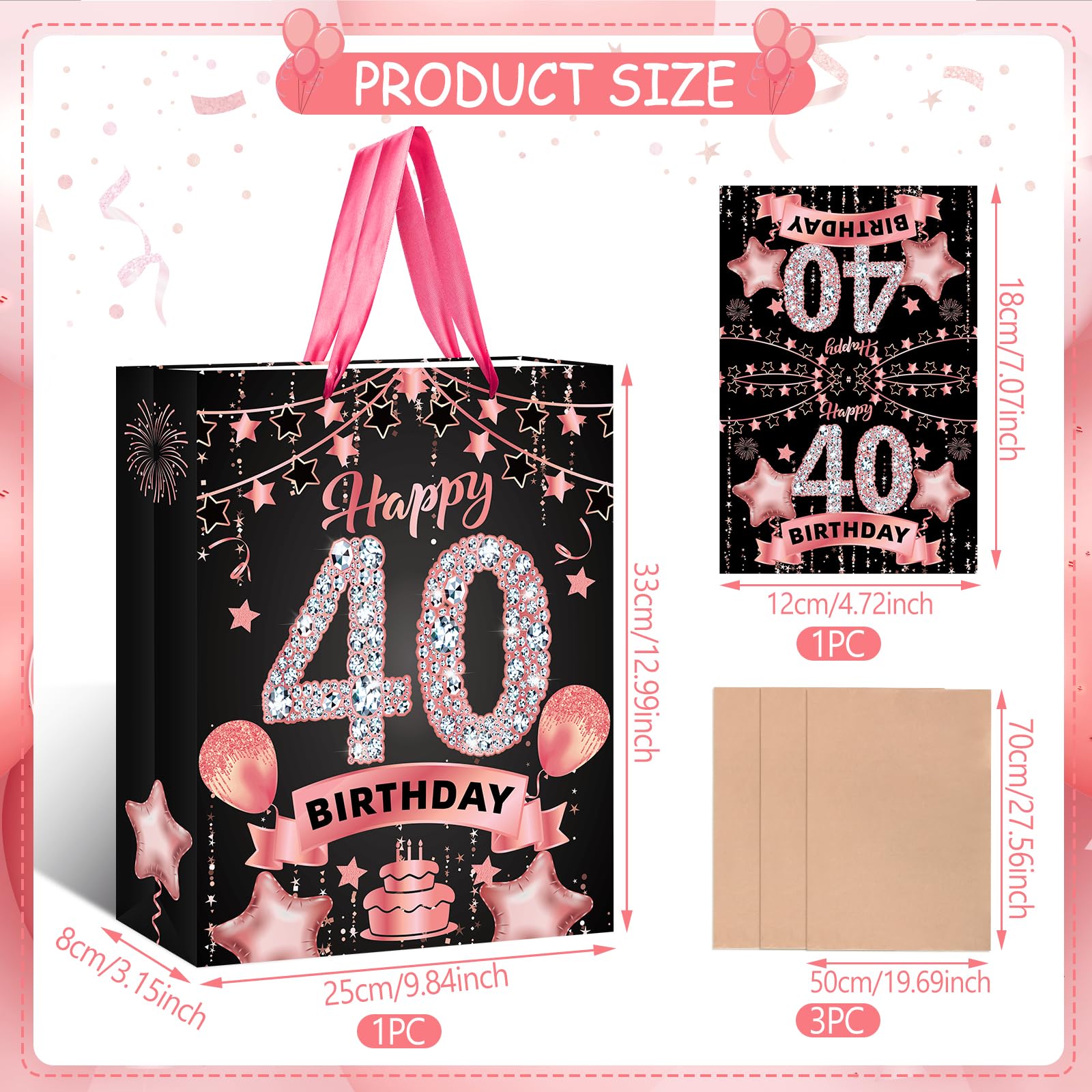 40th Birthday Gift Bag: This rose gold 40th birthday gift set includes 1 piece 40th birthday gift bag + 1 piece 40th birthday greeting card + 3 pieces tissue papers,and the 40th birthday gift bag features exquisite 40th birthday celebration pattern, such as cakes, balloons, fireworks which will leave a deep impression
