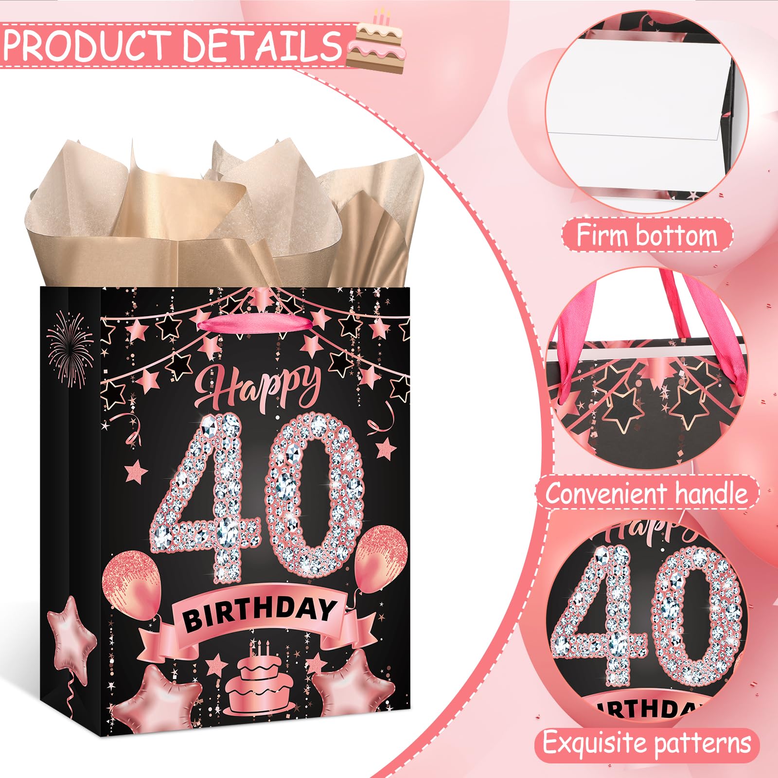 Quality Material: The material of the rose gold 40th birthday gift bag is crafted with durability in mind, the 40th birthday gift wrap bag is made of thick cardboard, come with nice ribbon handles and supportive reinforced bottom,the quality material of the 40th birthday bag ensures that it can be reused