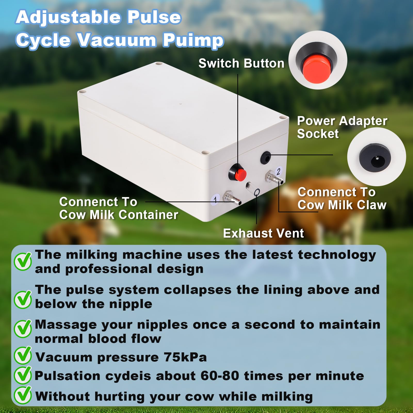 【Pulsation System 】The pulsation system collapses the liner aboves and below the teat, about once a second, massaging the teat and maintaining normal blood flows, preventing damage or soreness to the teat caused by constant vacuum.The pulsating vacuum milking machine comes with a power adapter that supports connection to a 12V portable power source (Must be purchased separately)