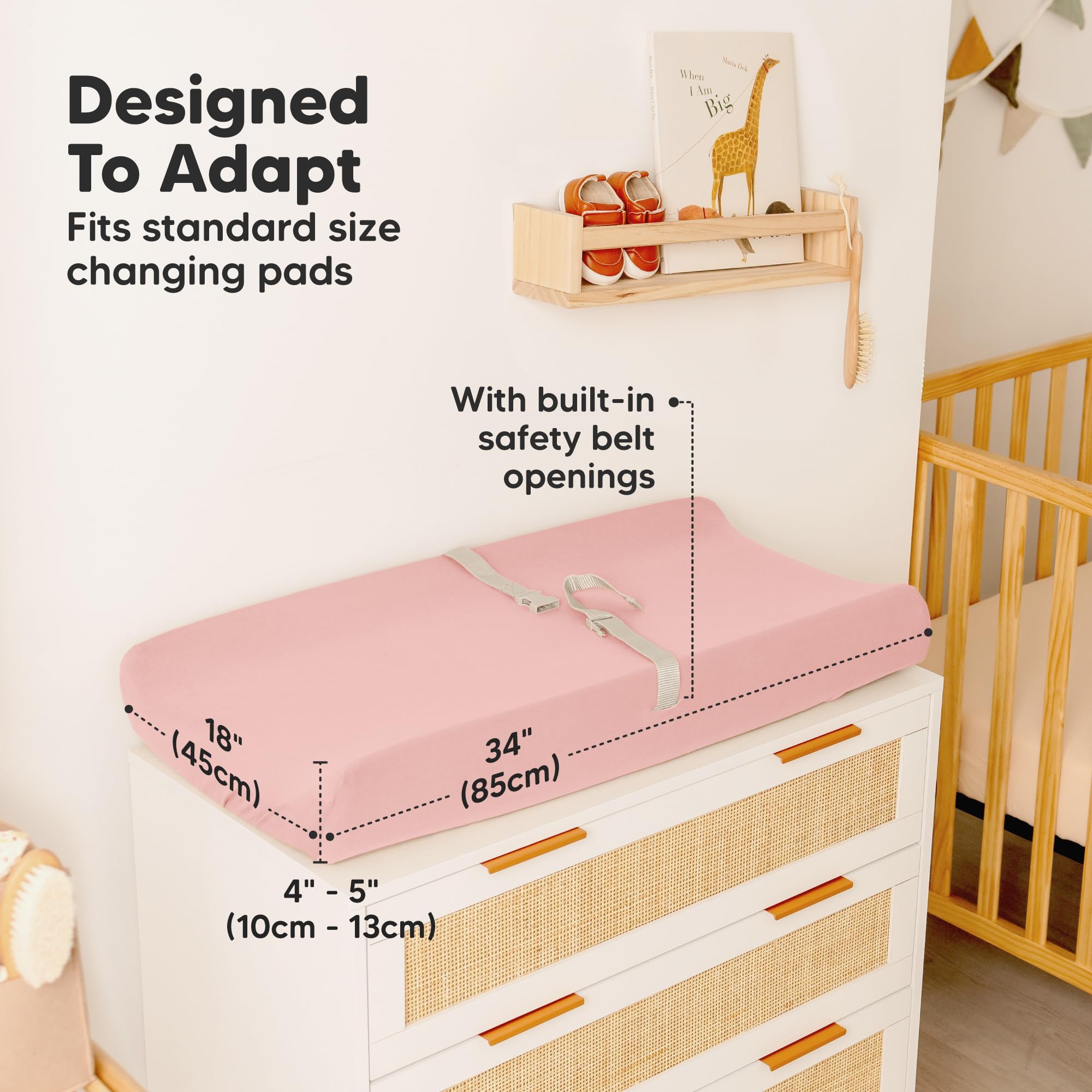 Instant Adapt - The Soothe Diaper Changing Table Covers are designed to fit the curves of any standard 34" x 18" and up to 5" height contoured changing pad. With built-in buckle holes for safety straps, they ensure a snug and secure fit.