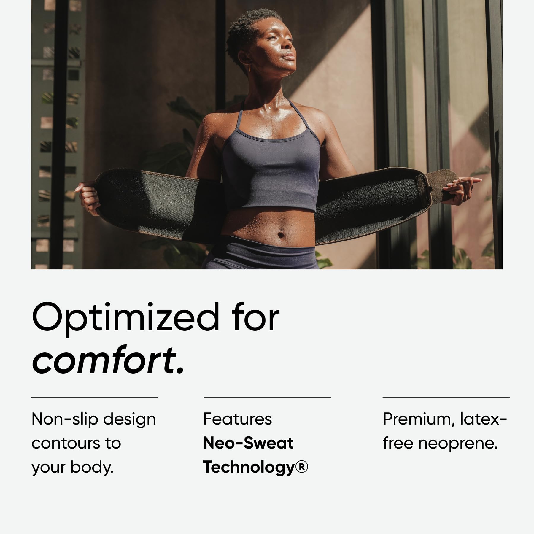 SWEAT FASTER, SWEAT HARDER: Waist trimmer designed with Neo-Sweat Technology, an anti-slip, moisture-repelling interior that provides superior heat insulation to increase core temperature for a harder, faster sweat and to cut excess water weight