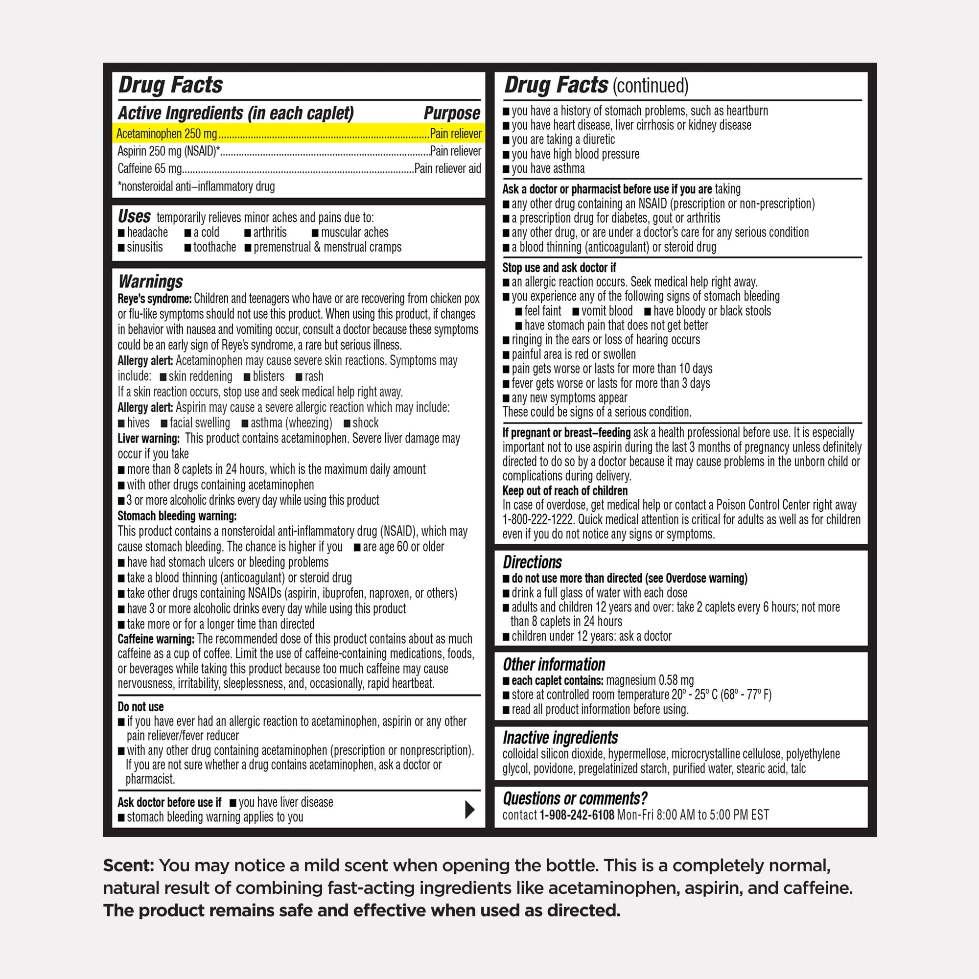 🔴 Fast-Acting, Triple-Ingredient Formula for Maximum Relief: Each caplet contains acetaminophen 250 mg, aspirin 250 mg, and caffeine 65 mg to work together for powerful headache, migraine, and body pain relief. This trio of active ingredients tackles inflammation, boosts pain tolerance, and improves blood flow—ideal for tension headaches, sinus headaches, and migraine symptoms.