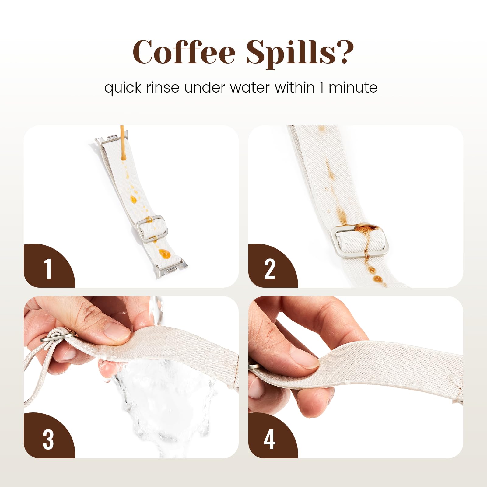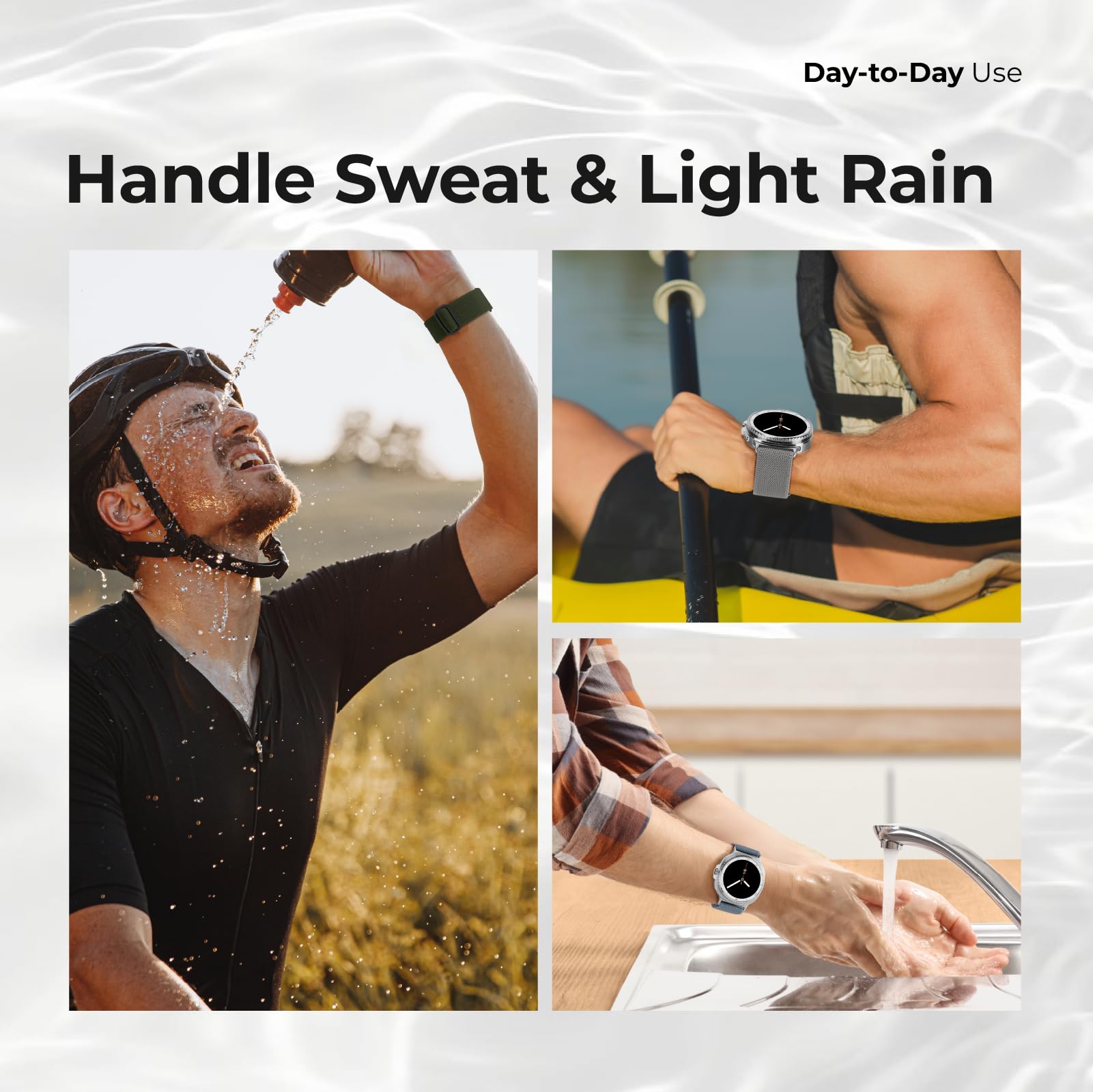 【Water Resistant】Acextro innovative splash-proof stretchy Samsung Galaxy Watch band allows droplets slides away which makes it handle sweat, light rain, and even accidental splashes without any issues. For some types of spills on this galaxy watch 7 band, like coffee, just a quick rinse under water within 1 minute and you will get a clean band