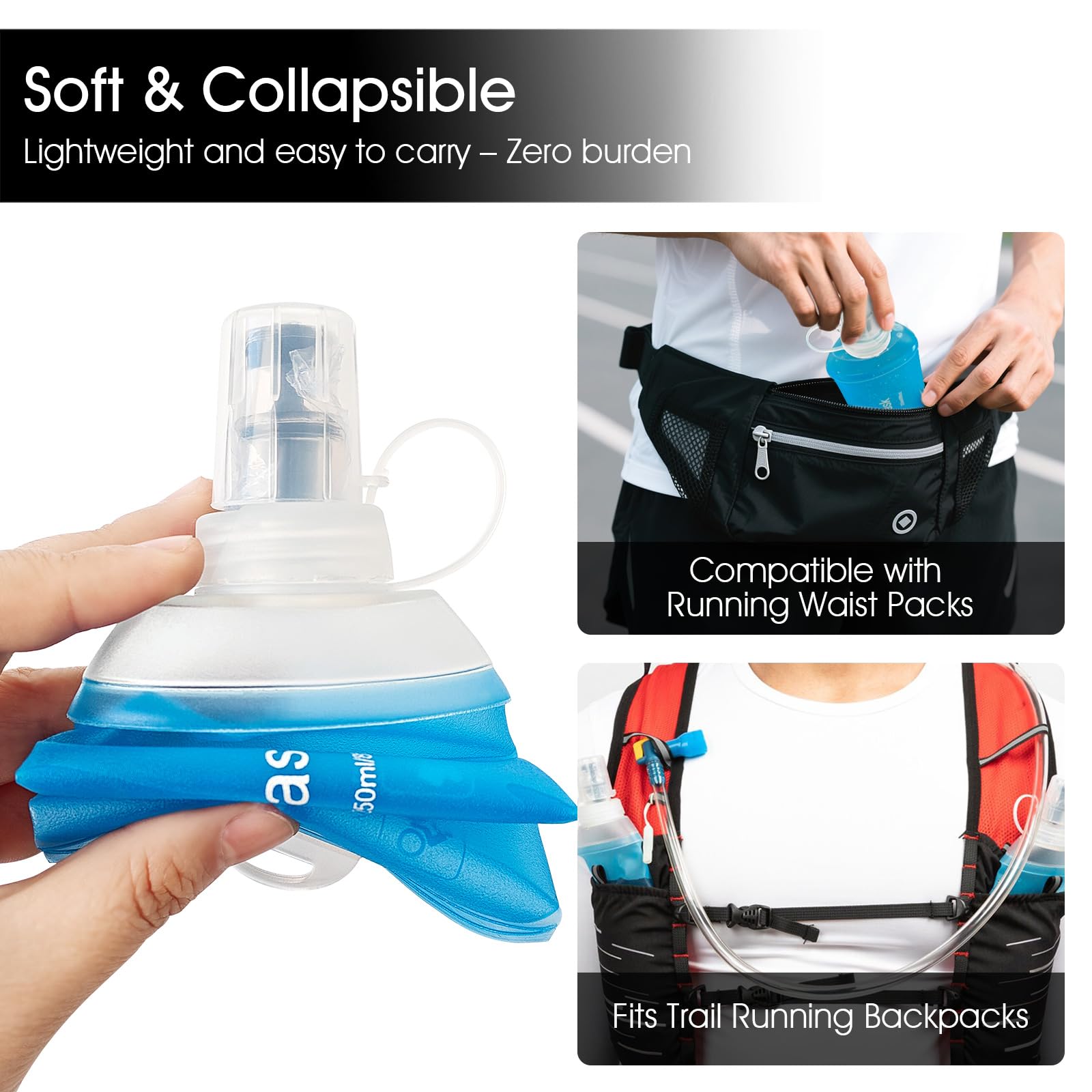 Ultra-Compact and Squeezable Design: Made of food-grade TPU (thermoplastic polyurethane) flexible and lightweight material, BPA & PVC-free, the soft water bottle can be easily collapsed when empty. Its squeezable nature allows you to easily control the flow of water during activities such as running or hiking.