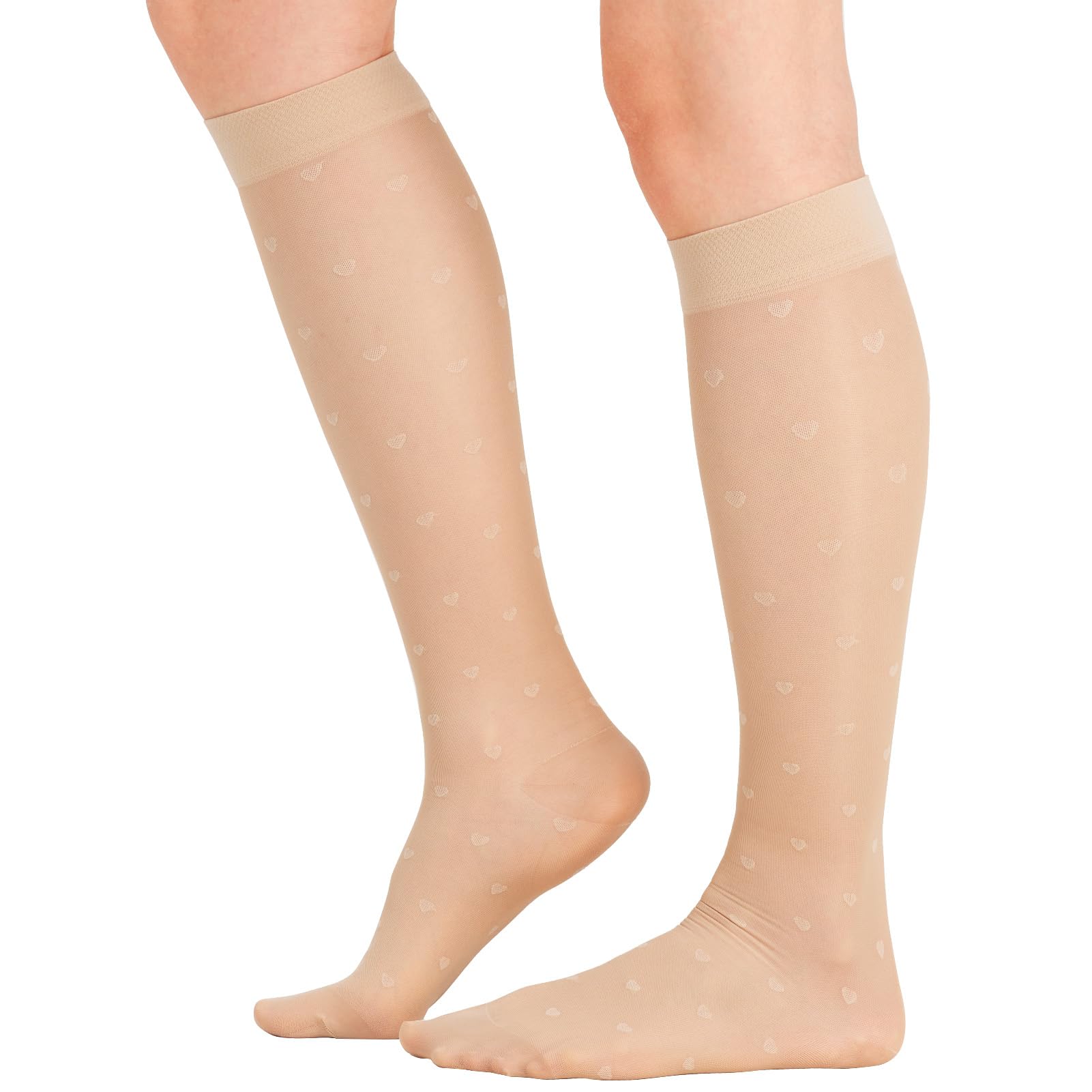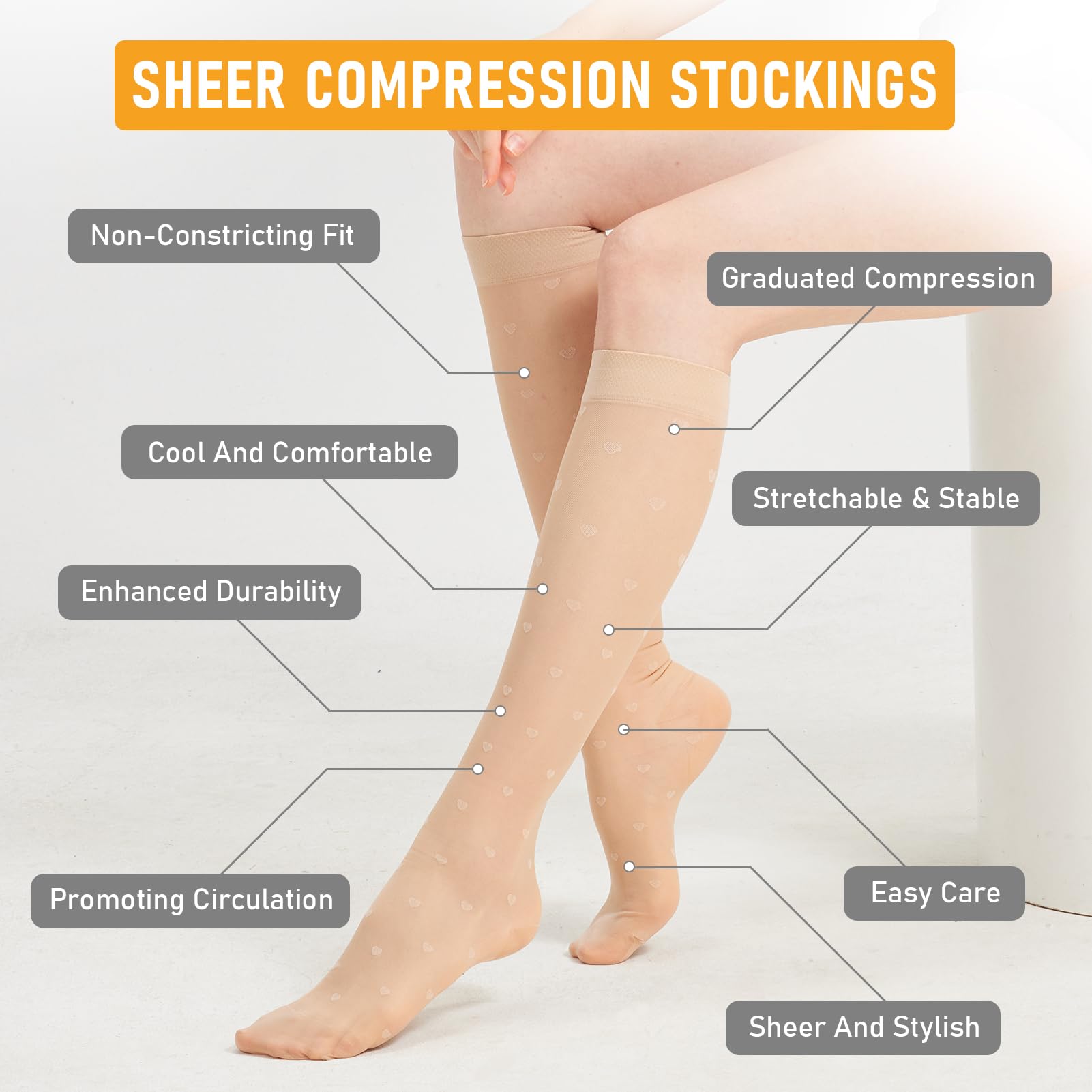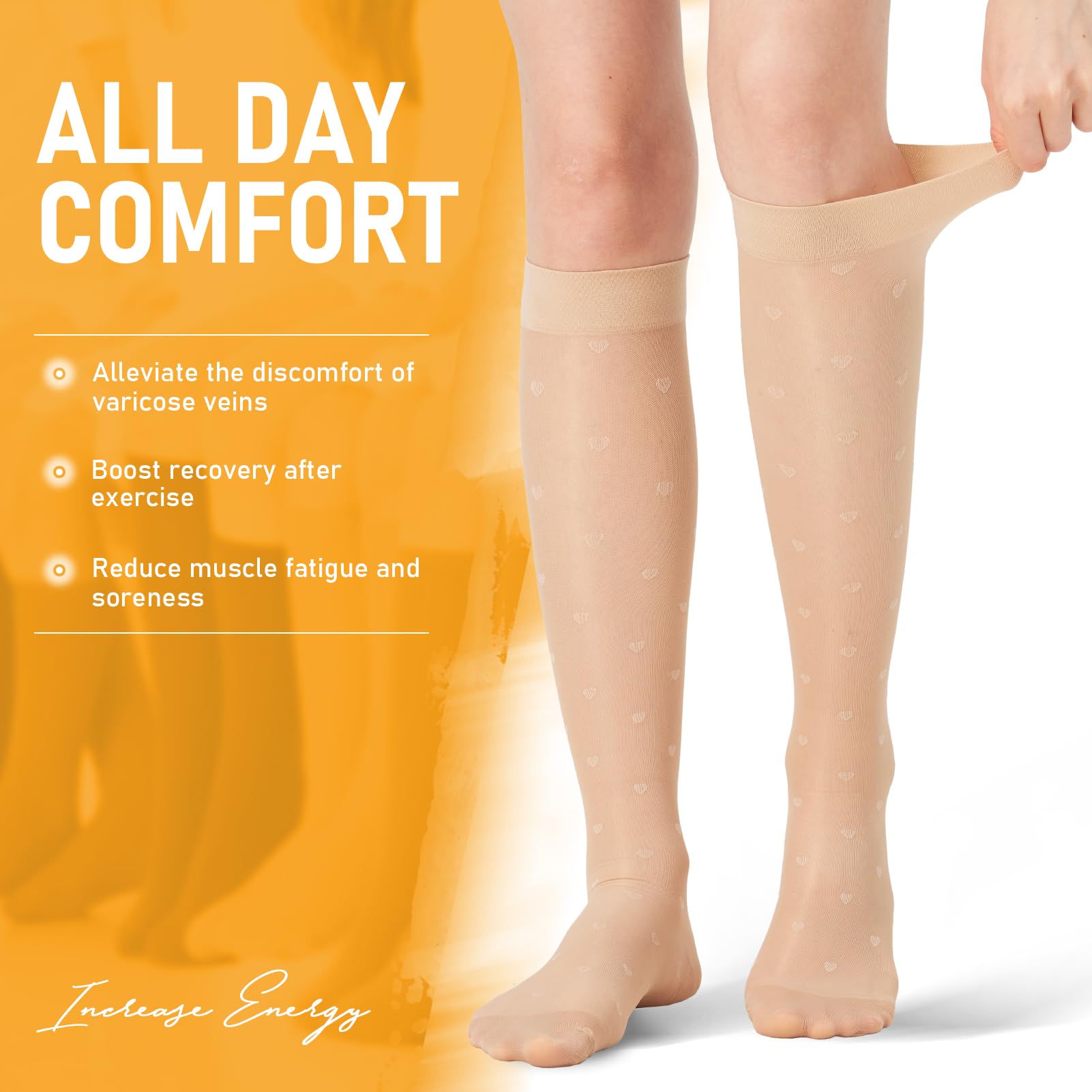 2 Pairs Sheer Compression Socks for Women - 15-20 mmHg Knee High Sheer Compression Stockings for Support Circulation Swelling Edema Work Office Travel, Heart, Large
