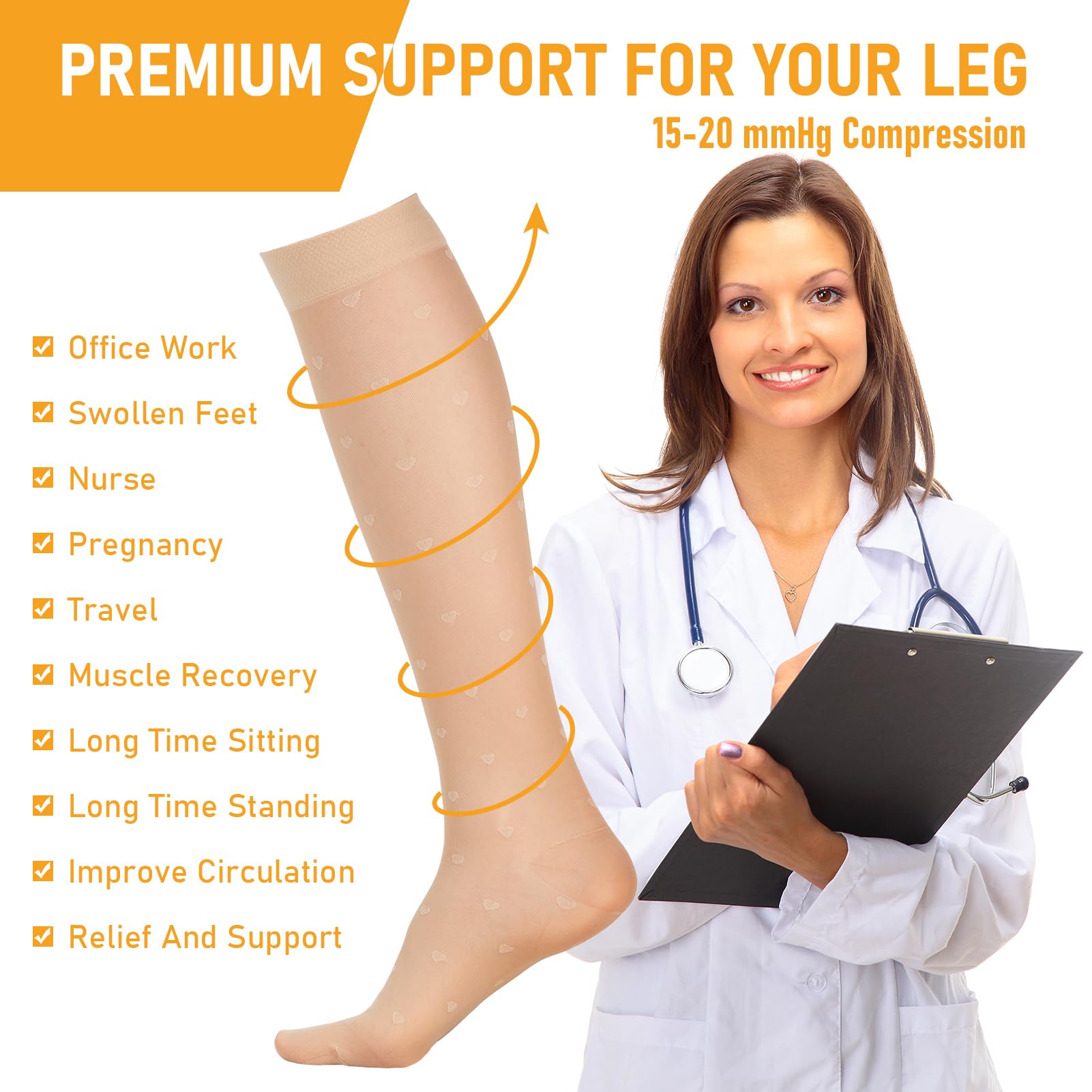 Graduated Compression: Engineered with a 15-20 mmHg graduated compression, these sheer stockings are precision-crafted to boost circulation, reduce fatigue, and alleviate the discomfort of sore aching tired legs, swelling, varicose veins, spider veins, edema, DVT blood, clots and other circulatory issues. They are the ideal companion for frequent travelers, pregnancy, work, office, pregnancy, muscle recovery and professionals who spend long periods standing or sitting.