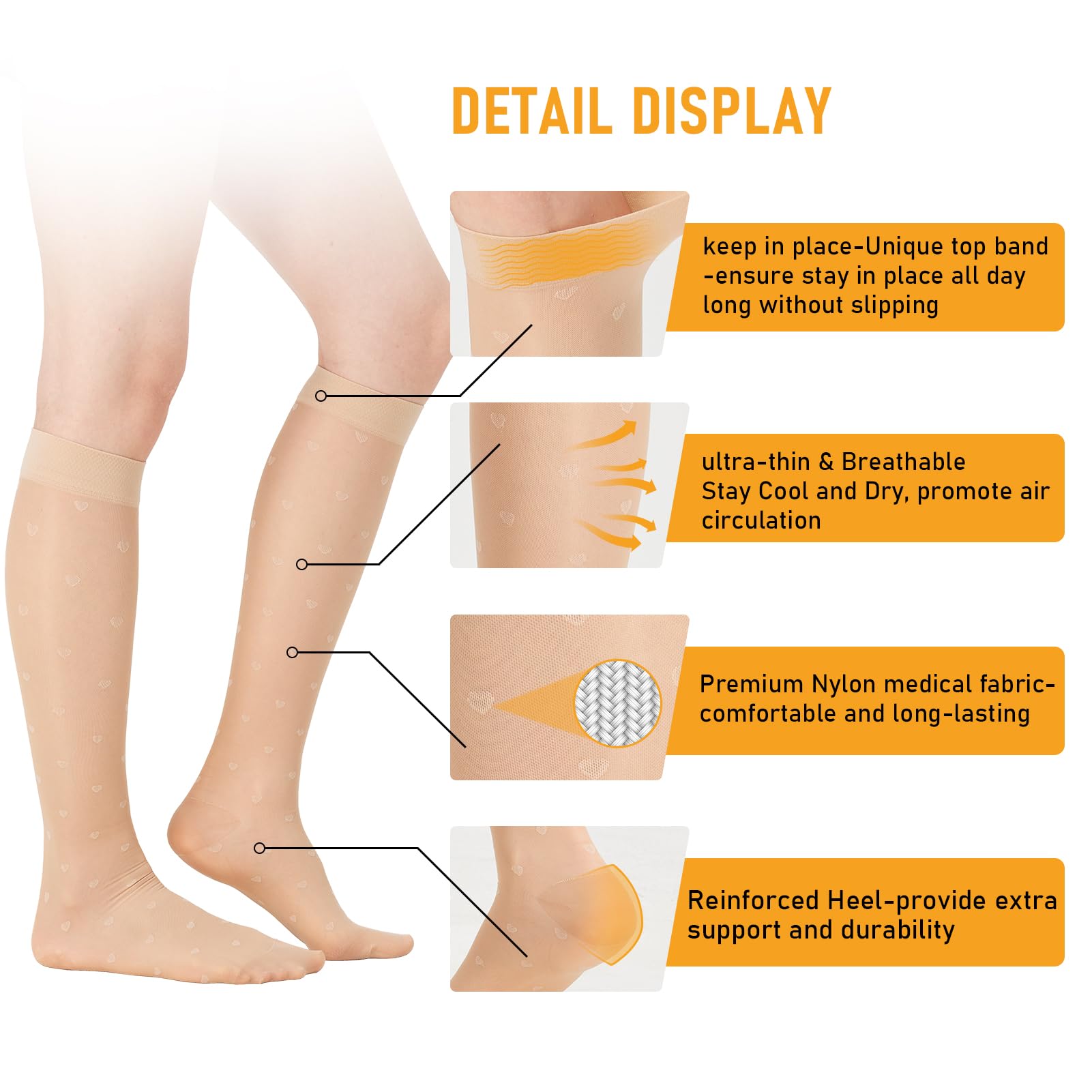 Enhanced Comfort & Stay in Place: Our sheer compression socks for women are crafted with a premium blend of 85% nylon and 15% spandex for breathability and comfort fit to your legs. The non-binding top band promises a snug fit without the discomfort of constriction, keep you feeling cool, making them perfect for all-day wear, even on the hottest summer days. Latex-Free.