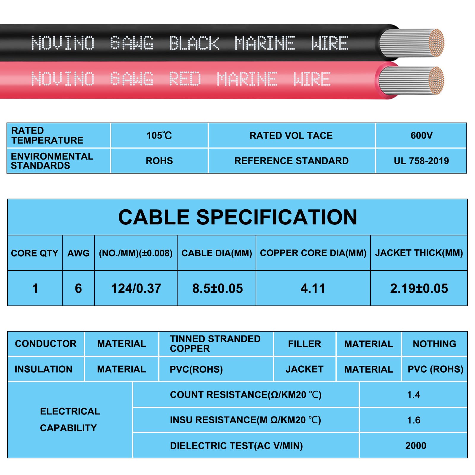 Boat Wire Cable Spec:Red&black conductor sheaths, tinned & stranded True 6 AWG copper wire,6 awg wire is insulation rated to 600v, 105 degrees C dry, and 75 degrees C wet