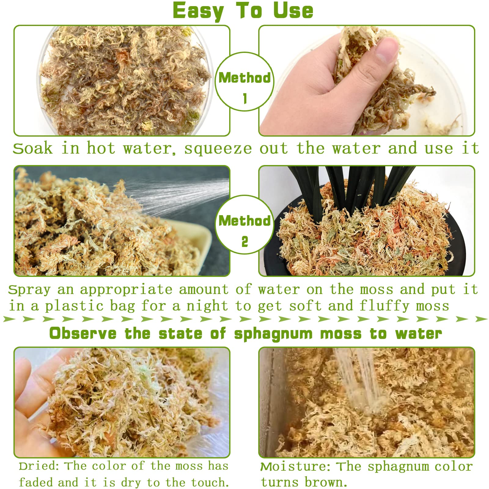 Premium Material: Sphagnum moss is premium quality natural dry moss, not contain any artificial colourings, it have good water retention and drainage, excellent ventilation, contains varieties of nutrients, not easy to spoil, can be used for a long time, and it is not necessary to update all materials when changing pots