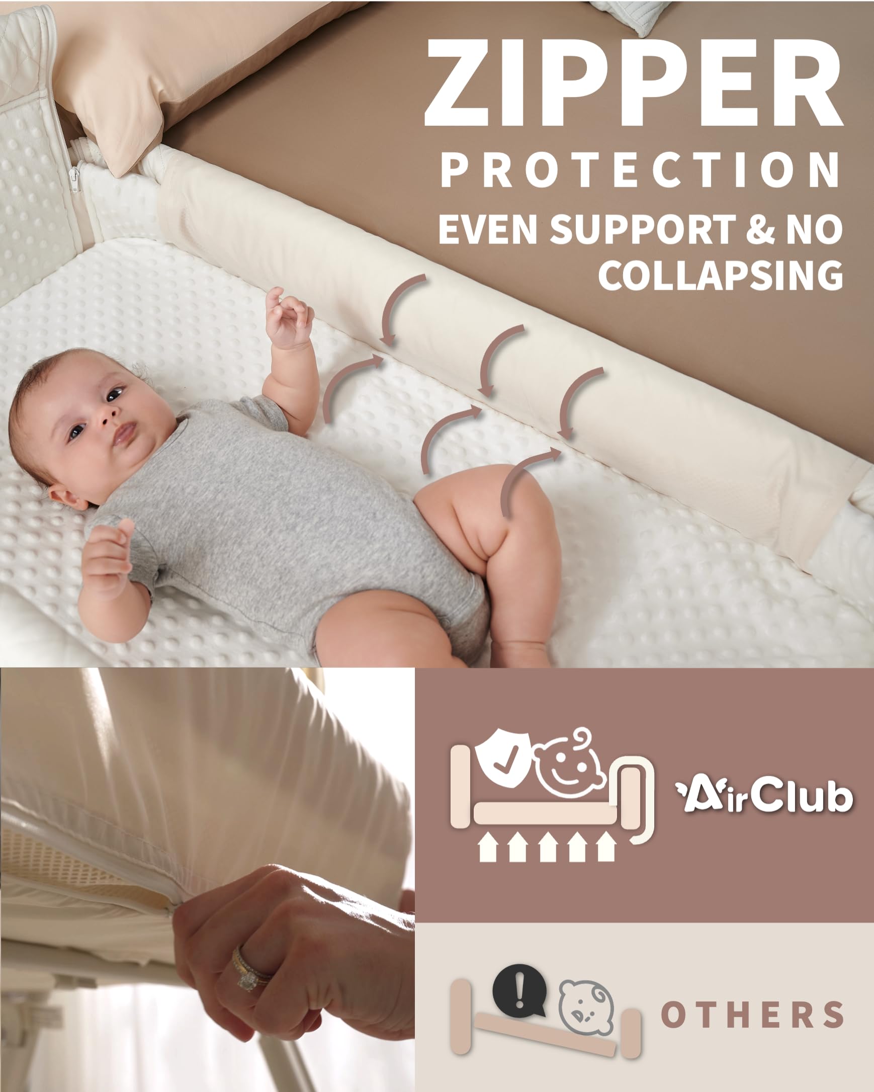 【RETRACTABLE SIDE|ZIPPER SCURED BEDSIDE SLEEPER】AirClub bedside bassinet for baby has a retractable side that can be UP/DOWN to provide direct access to your baby for a middle-of-the-night feeding, comforting, ideal for mum has C-section. The second layer bassinet bedside sleeper is secured by a zipper, making sure the second layer won't collapse to one side.