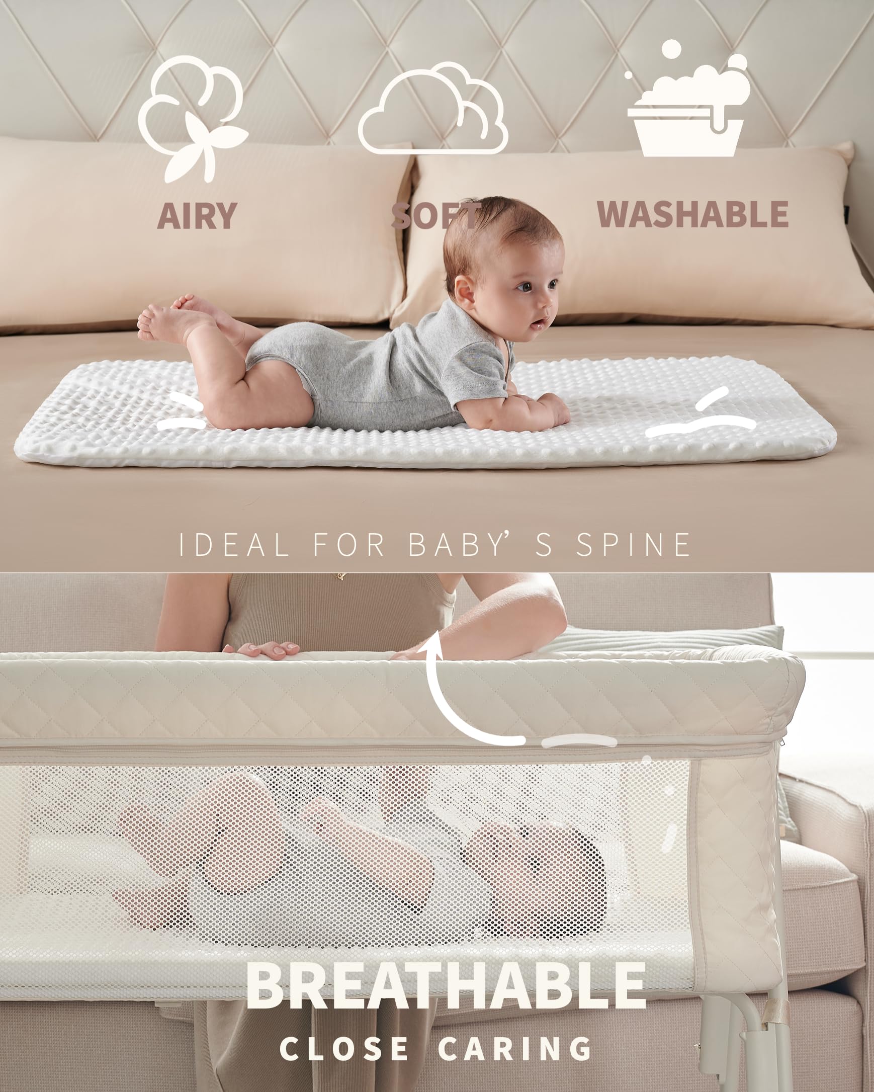 【BREATHABLE & COMFORTABLE|3D FLEECE MATTRESS + 2 SIDES MESH WALL】The AirClub bedside bassinet airy & soft mattress adapts a 3D FLEECE technique and snuggle dots covering all over it, providing a motherlike touch to baby and offers blissful levels of comfort to enjoy a peaceful, soothing sleep; Two-sided breathable mesh wall to maximize air circulation and improve visibility so that your baby will always sleep comfortably and you could keep an eye on the baby while reading, relaxing or doing your own business.