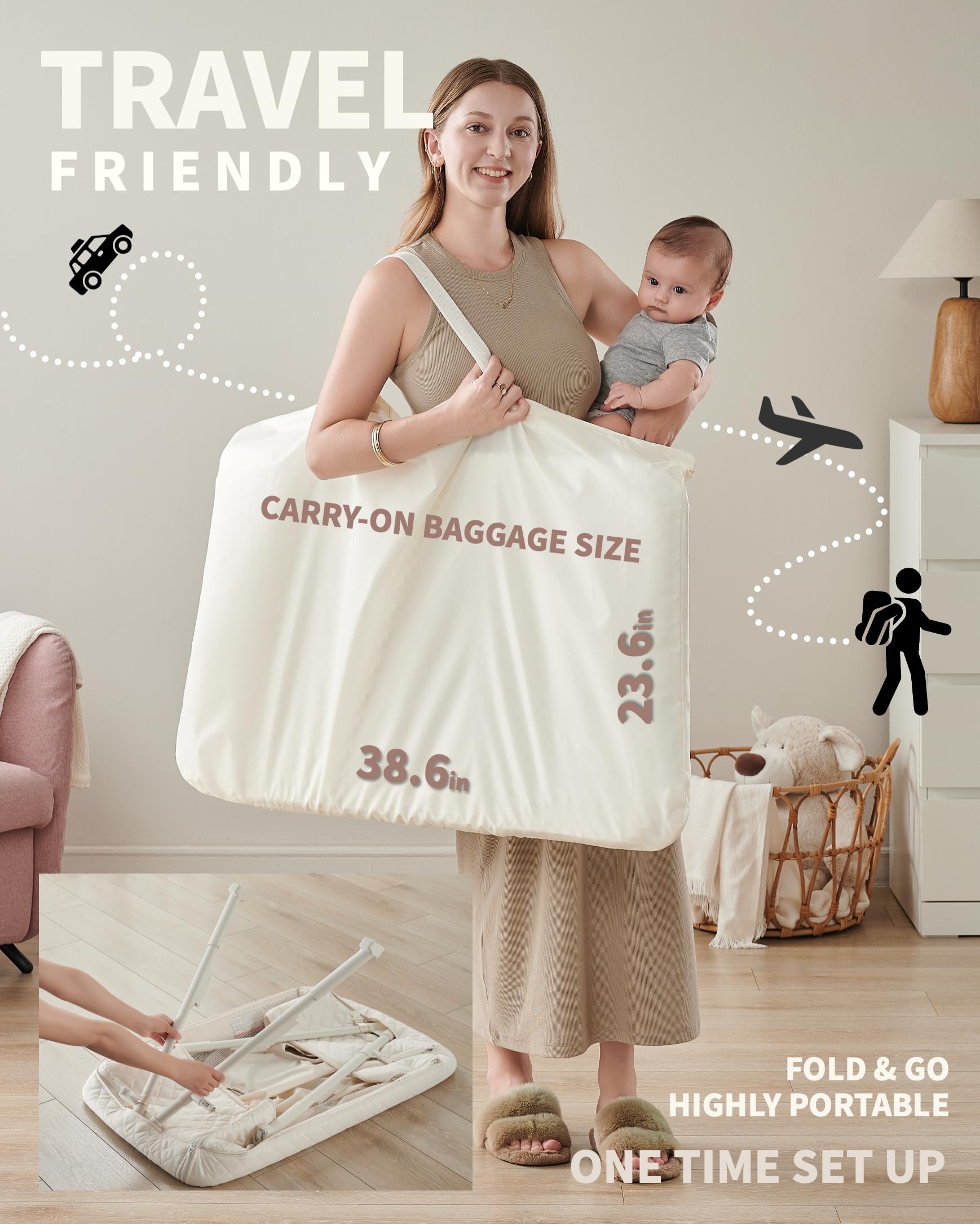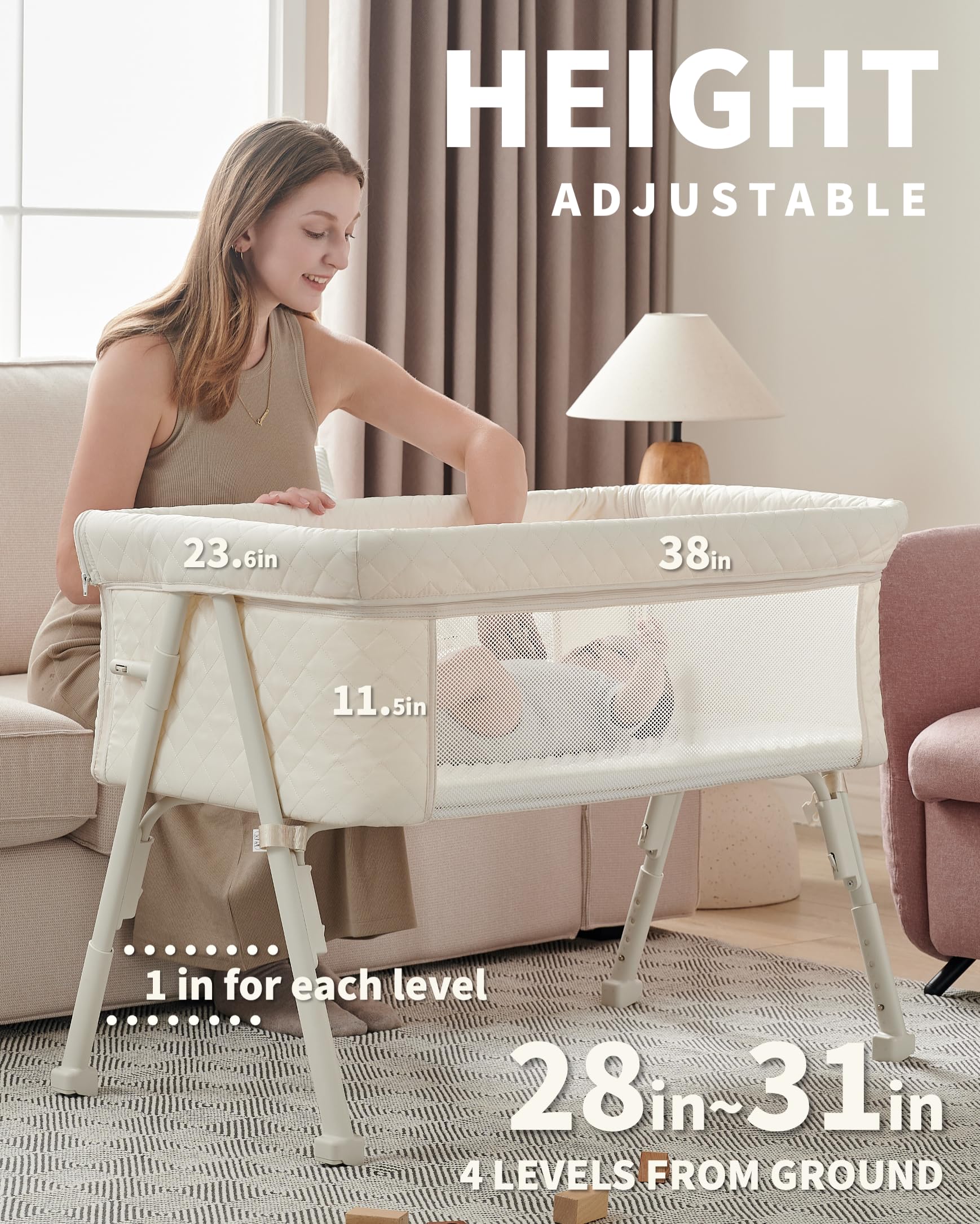 【COMPATIBLE WITH ALL PARENTS|4 LEVEL ADJUSTABLE HEIGHT】AirClub co-sleeper baby crib features 4 adjustment levels from 28'' to 31''(each 1'' apart)and can adjust this baby bassinets bedside sleeper according to the height of your bed. Meanwhile, you could adjust it to your preferred height in different scenes during the daytime, easier for you to care for your baby.