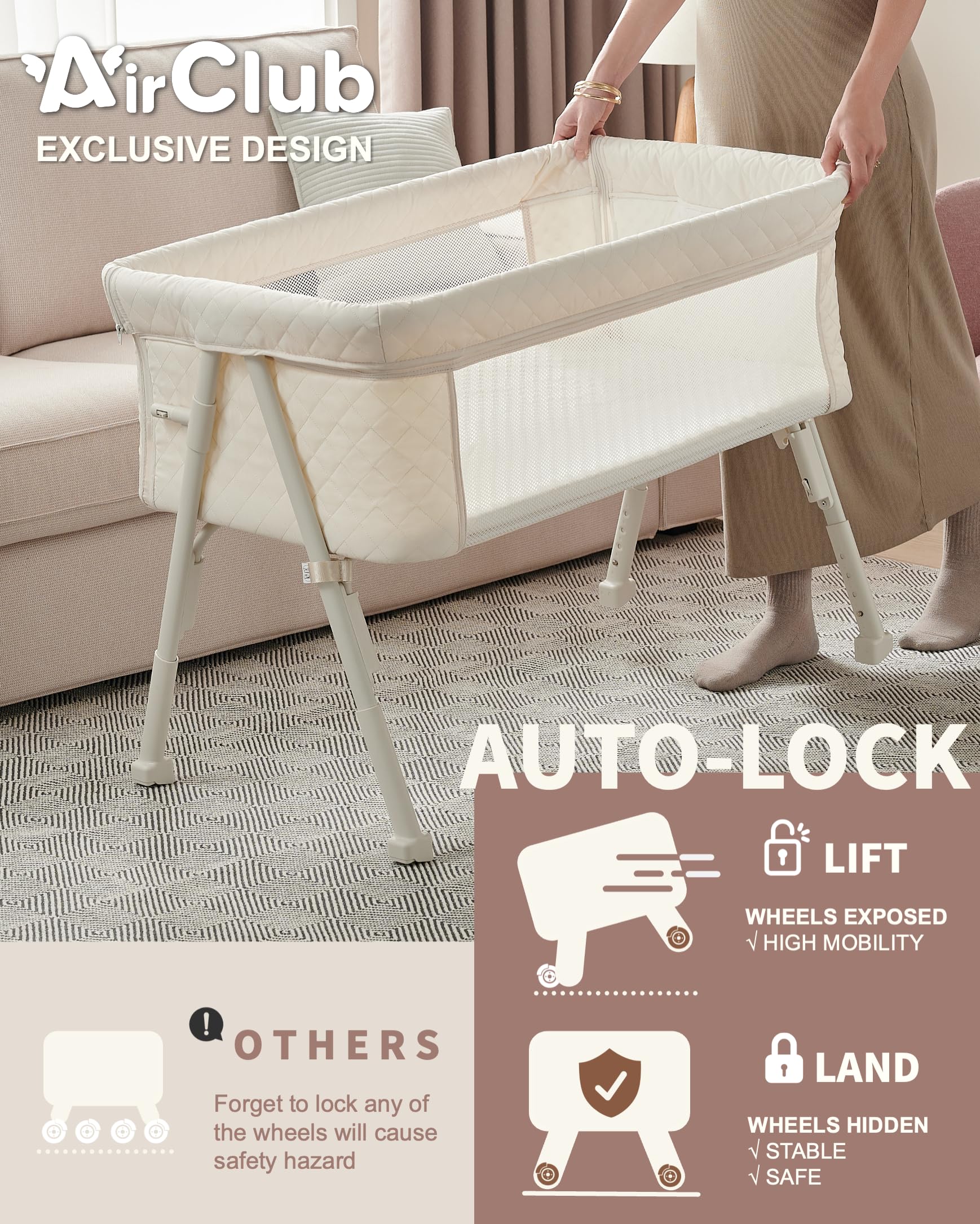 【EXCLUSIVE 4 AUTO-LOCK WHEELS | BRAKE-FREE & STABLE & SAFE】Compared with other products with brake wheels, AirClub bedside baby cribs equip 4 AUTO-LOCK wheels. By lifting one side, the supporting 2 feet will convert into 2 wheels, allowing smooth movement. By landing all 4 legs, the wheels will be retracted into the feet and ensure a tight grabbing on the floor. This exclusive design can avoid accidents in many situations where those wheel brakes are forgotten to lock.