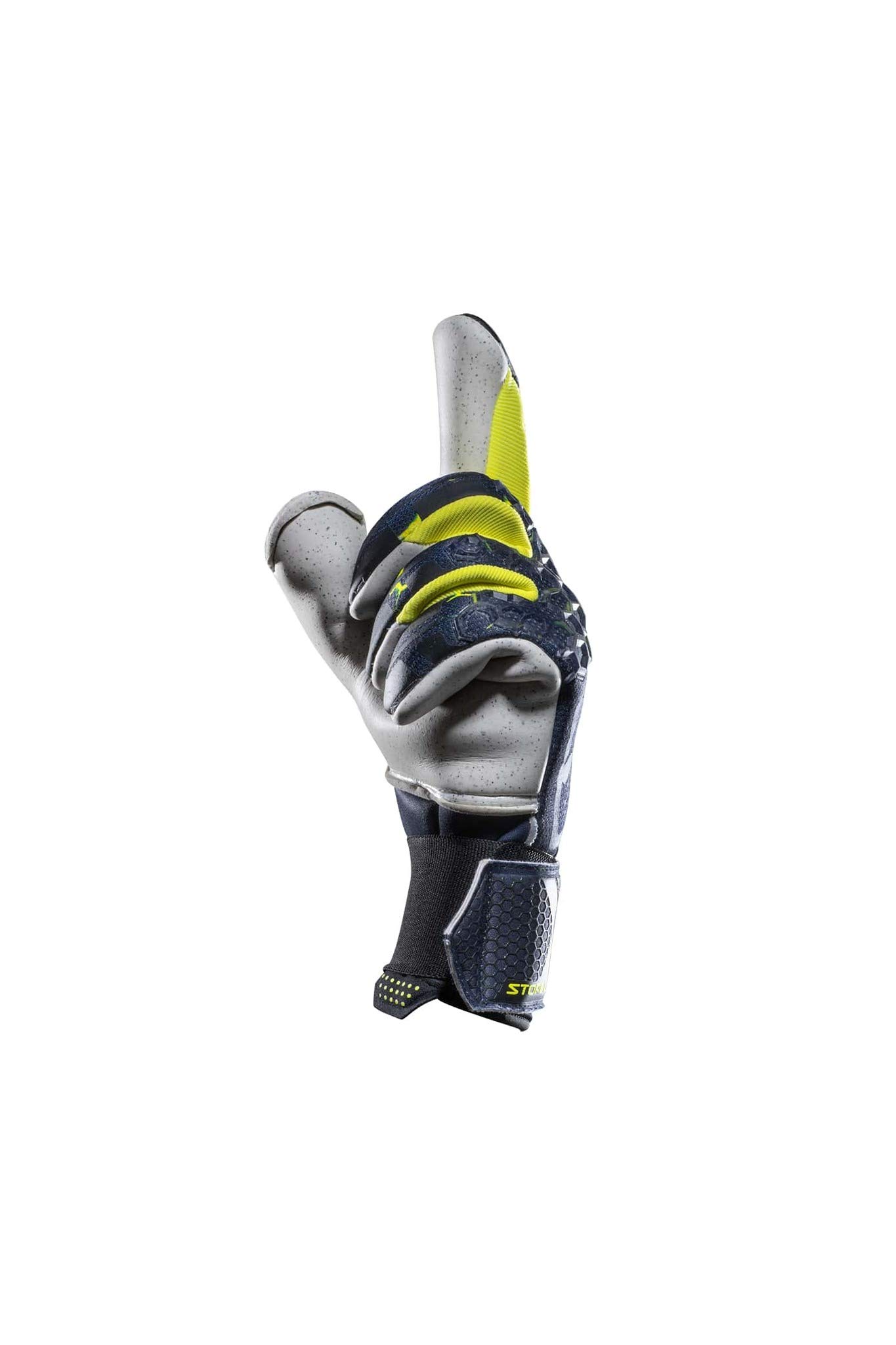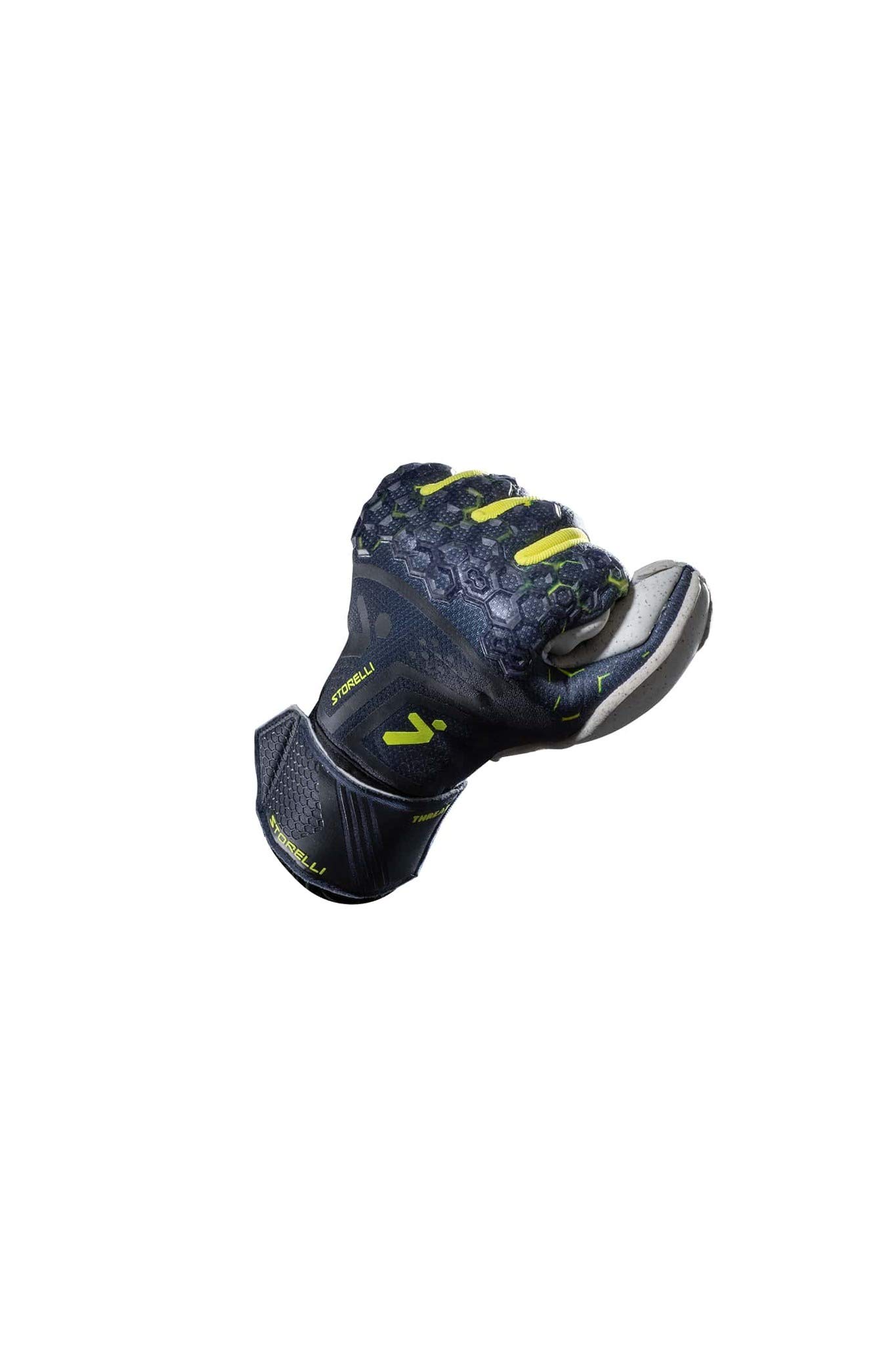 The Storelli Silencer Threat Goalkeeper Gloves are the best in professional high-performance finger protection and superior grip for competitive goalkeepers. Featuring 3.5mm of high-grade German Quartz latex and 3mm of impact-absorbing foam to ensure palm protection and superior grip, these gloves are ideal for soccer and heavy-duty sports. The gloves feature rubber hexagon-patterned punch zones for extra bounce and advanced ball control. These comfortable goalkeeper gloves include 5 removable plastic finger spines that reduce the risk of injuries such as bended or jammed fingers, while allowing for customizable comfort. The negative palm cut allows for enhanced flexibility while the roll fingers provide a superior and tackier grip. The gloves feature a full wrist wrap which prevents bunching and gives hands added comfort and security Play all day with these breathable gloves, designed with mesh finger and backhand panels to ensure dry performance in all conditions. Enjoy fresh gloves all day with the breathable glove bag included in your purchase. The Storelli Silencer Throat Goalkeeper Gloves includes a set of 2 (pair) black and neon yellow trim ambidextrous gloves available in sizes 6-11. The gloves are made with latex, polyester, neoprene, and nylon materials while the punch zones are polybutadiene rubber and the finger spines are plastic.