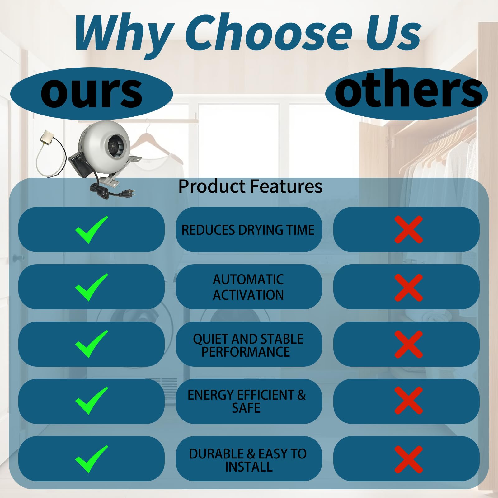 ENERGY EFFICIENT & SAFE: Shorter drying cycles reduce electric costs and extend the life of clothes dryers. This dryer vent fan booster helps prevent lint buildup in the duct, lowering fire risks and keeping the vent hose clear. The efficient air booster fan design makes it a safe choice for both residential dryers and duct vent booster systems.