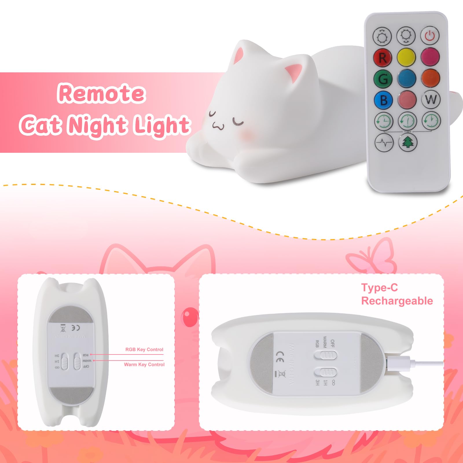 Cute Cat Baby Light Lamp: Cat night light is made of BPA-free silicone, soft and washable material, 100% safe and hygienic for kids. Warm white and 7 colors breathing mode. This night lamp is a ideal gift for boys, children, teens, and cat lovers.