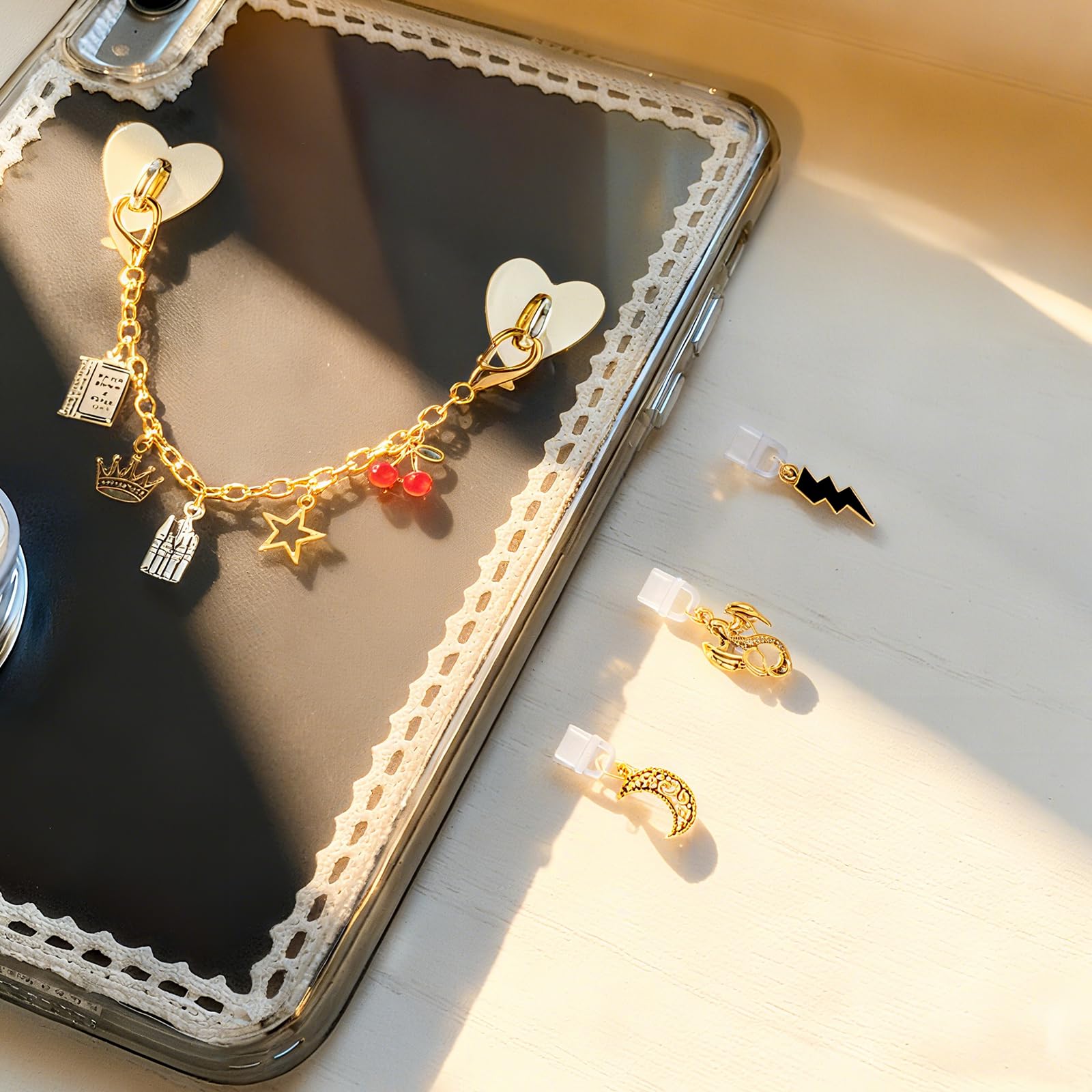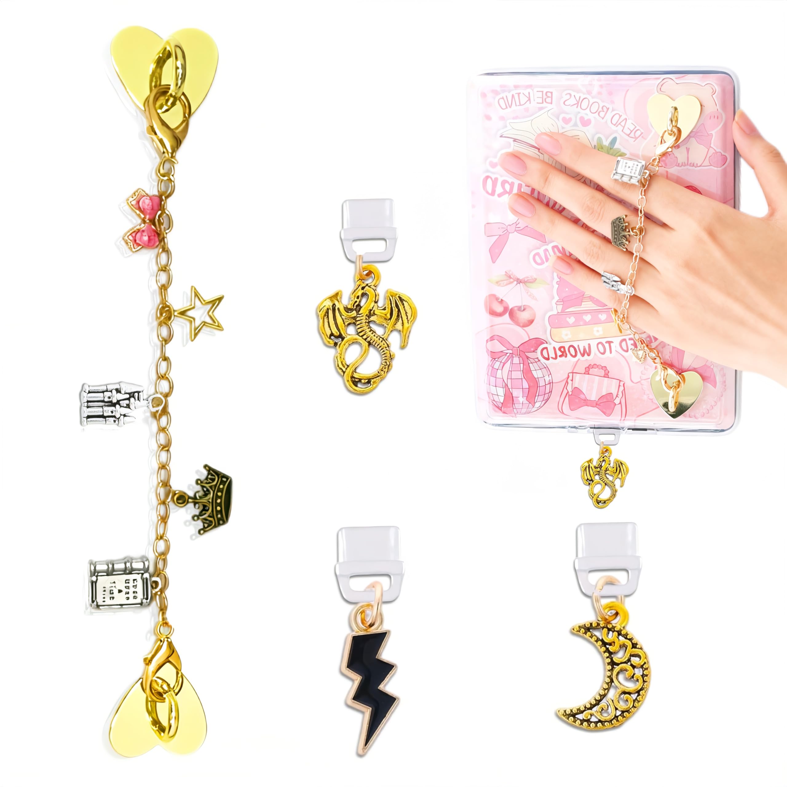 Complete Accessory Set: Includes 4 pieces—3 Elegant and lovely Type-C dust plugs and 1 gold charm chain designed to decorate for Kindle, e-reader, or smartphone with a personalized, fashionable flair
