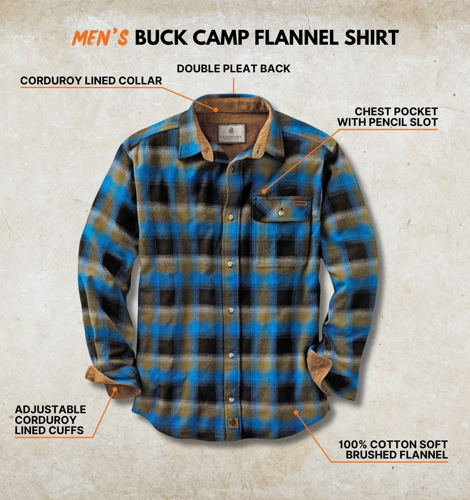 Description Our original single pocket flannel - The Buck Camp Flannel Shirt is the perfect weight to wear alone or layered over a t-shirt or under a shirt jacket. The traditional style and signature corduroy details offer unmatched durability, while the relaxed fit and brushed cotton flannel provide ultimate comfort. With multiple exclusive plaids and solids, they're suitable for any occasion from the woods to the office. The Buck Camp Flannel Shirt gives you an incredible "bang for your buck"! Big & Tall sizes are designed for men over 6'2" and add 2" in body length and 1-1⁄2" in sleeve length.