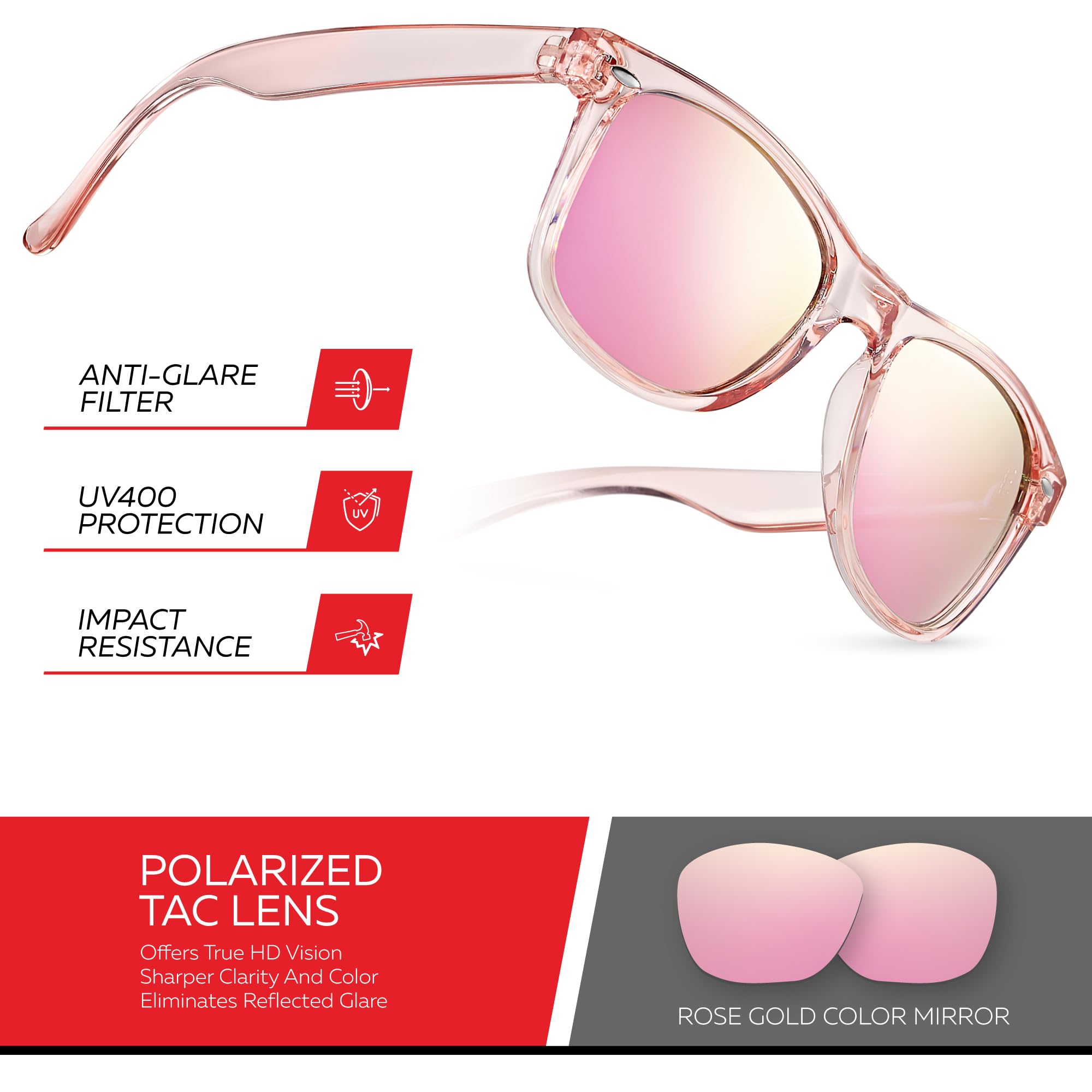 🕶️ 1.1MM TAC POLARIZED LENSES WITH UV400 PROTECTION: Keep your eyes safe from that annoying glare from shiny surfaces (e.g. pavement, snow or water) with our designer sunglasses for women and men, which feature polarized anti-glare lenses with UVA & UVB protection.