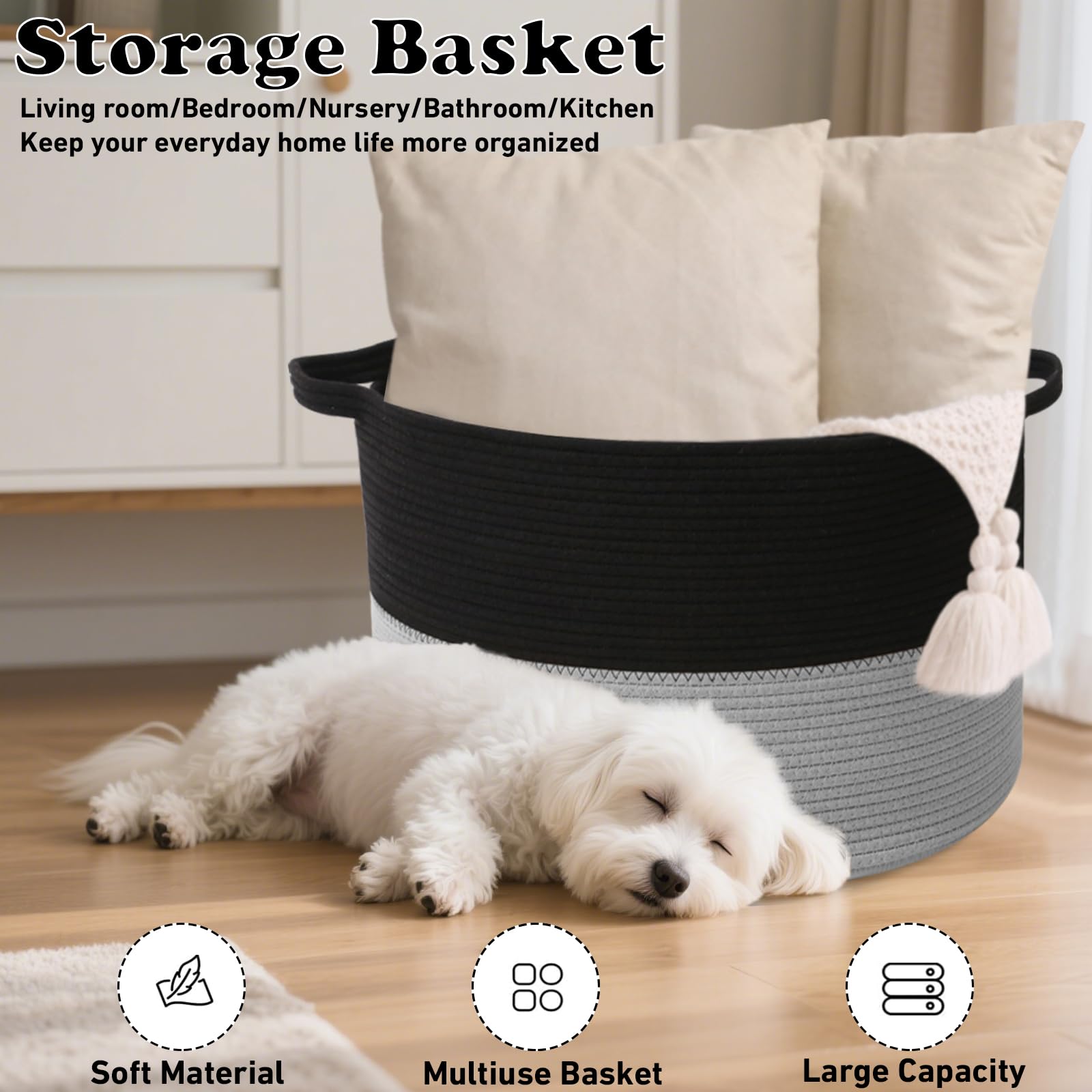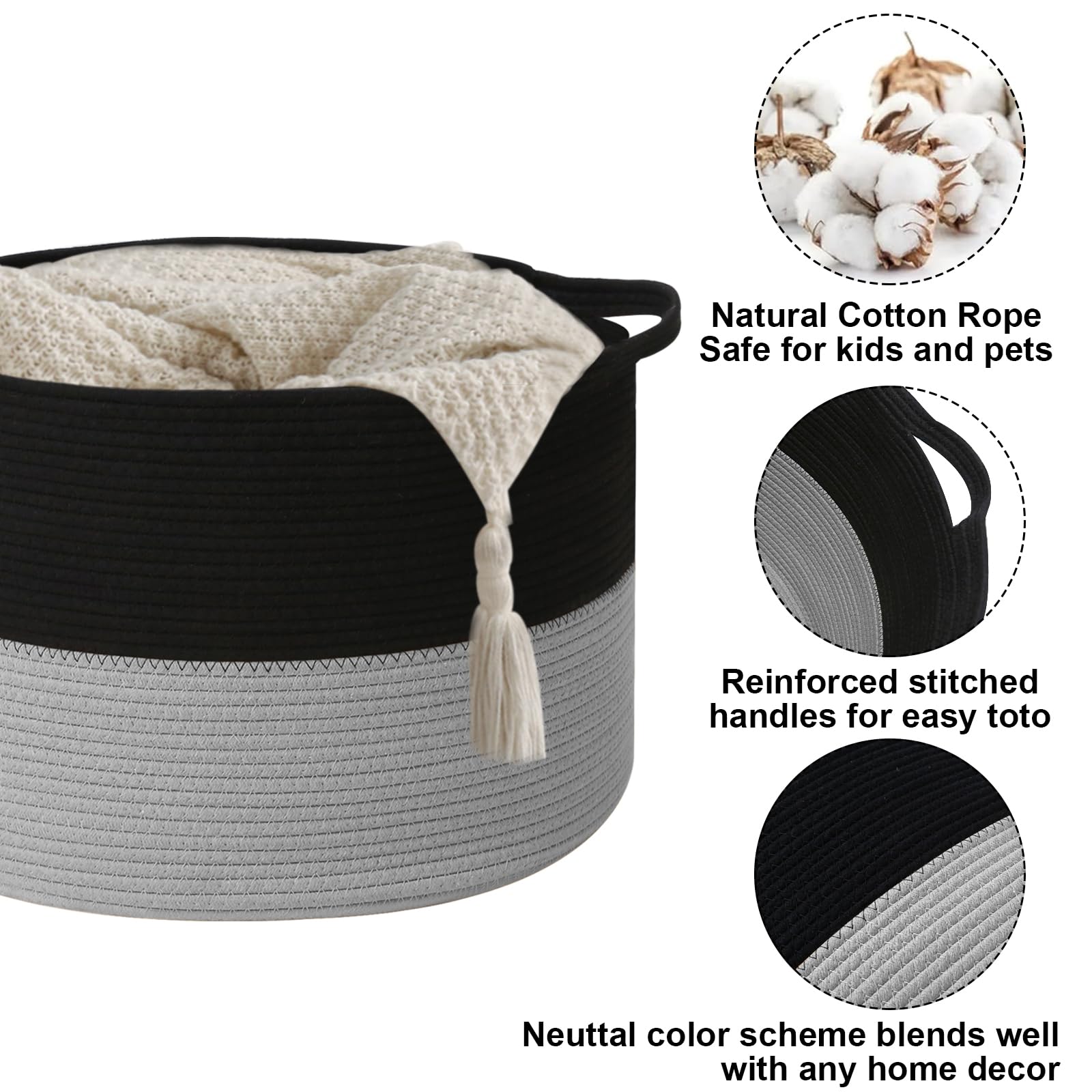 【High-Quality Craftsmanship Design】Made with soft, durable cotton rope. Slow-woven for even texture and long-lasting durability. The two built-in handles are sturdy.Strong handles for easy carrying or move