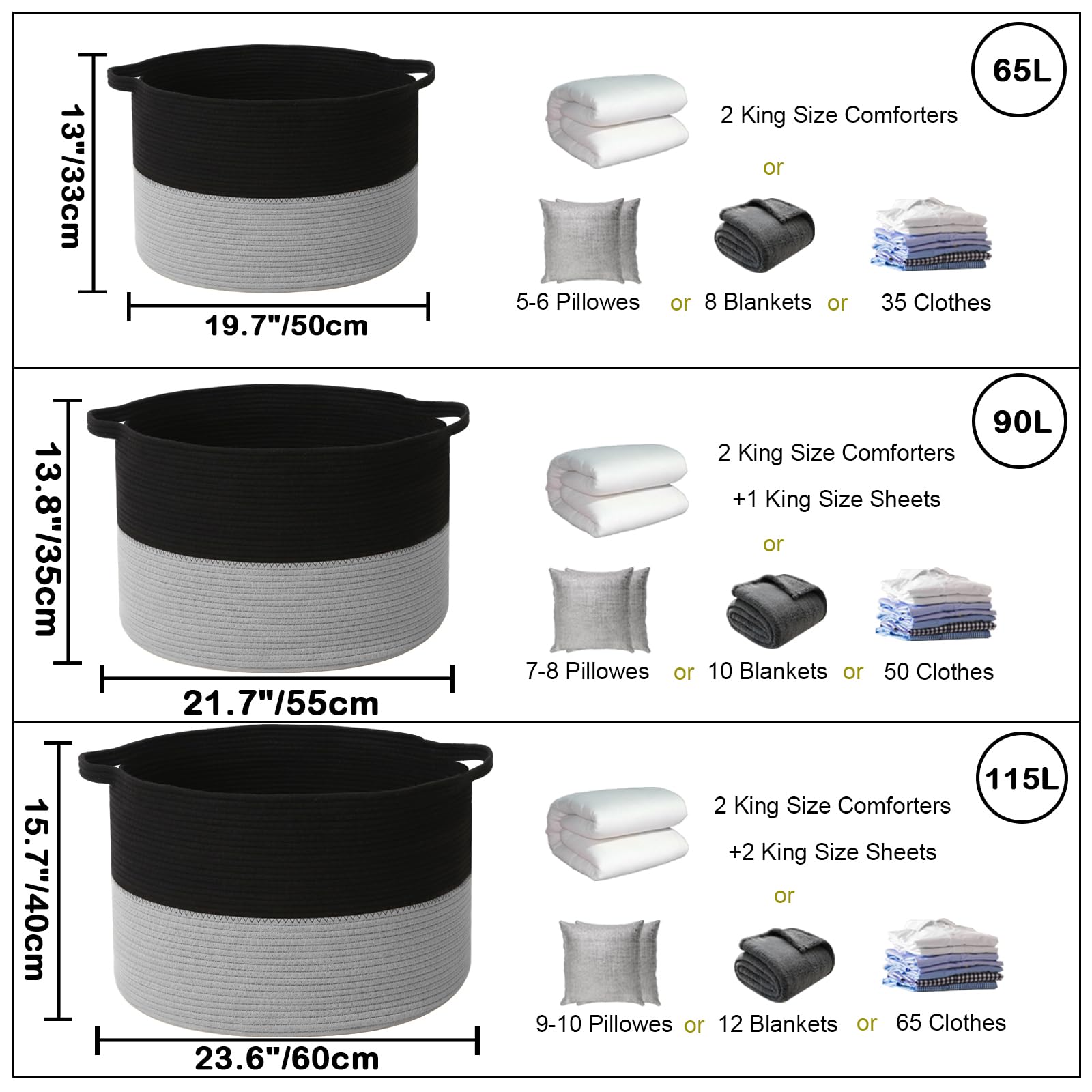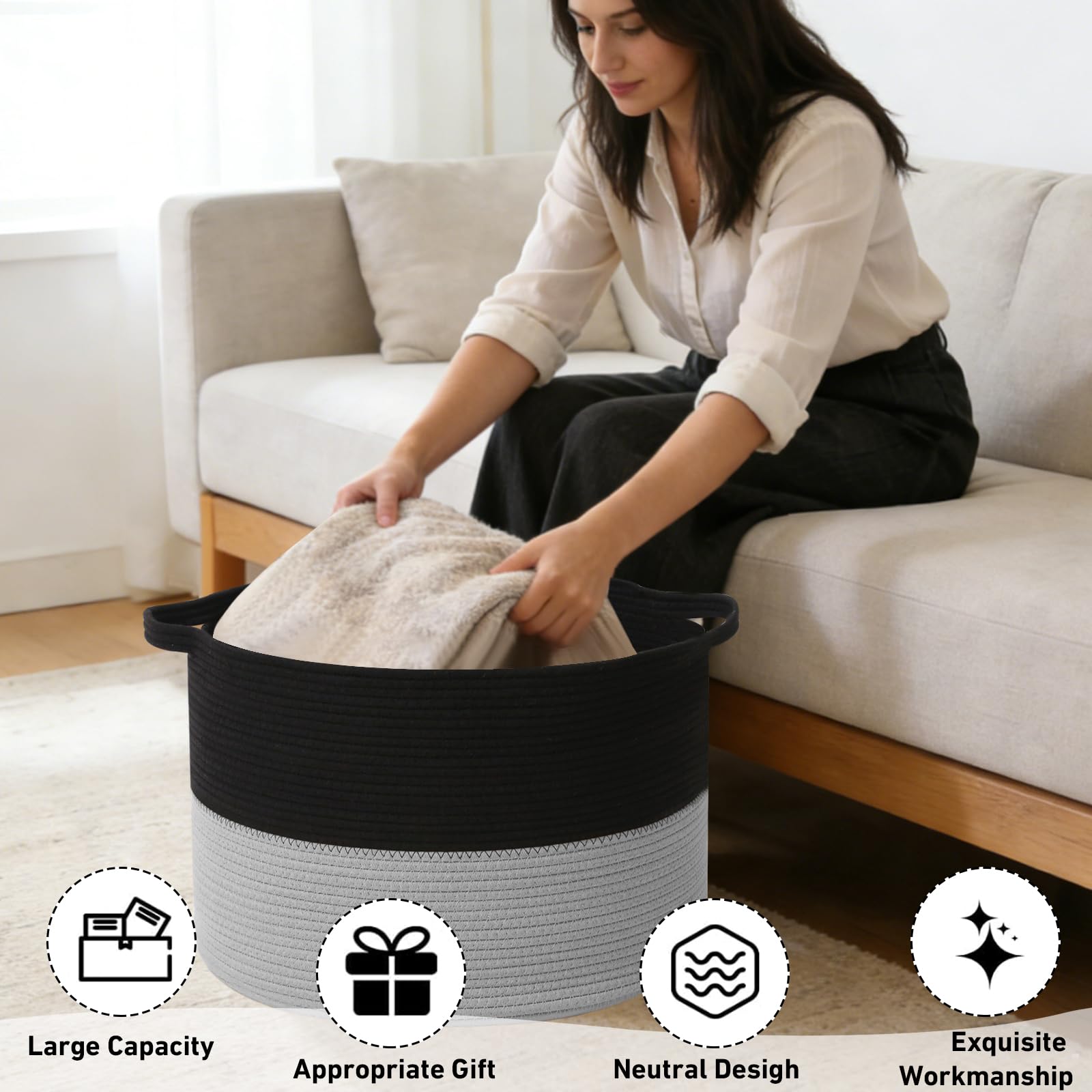 【90L Extra Large Capacity】This 21.7"L x 21.7"W x 13.8"H basket is perfect for storing throw blankets, pillow, cushions, clothes,towels,toys and stuffed animals.It can also add a nice style to your living room, bedroom, laundry room, nursery or any room