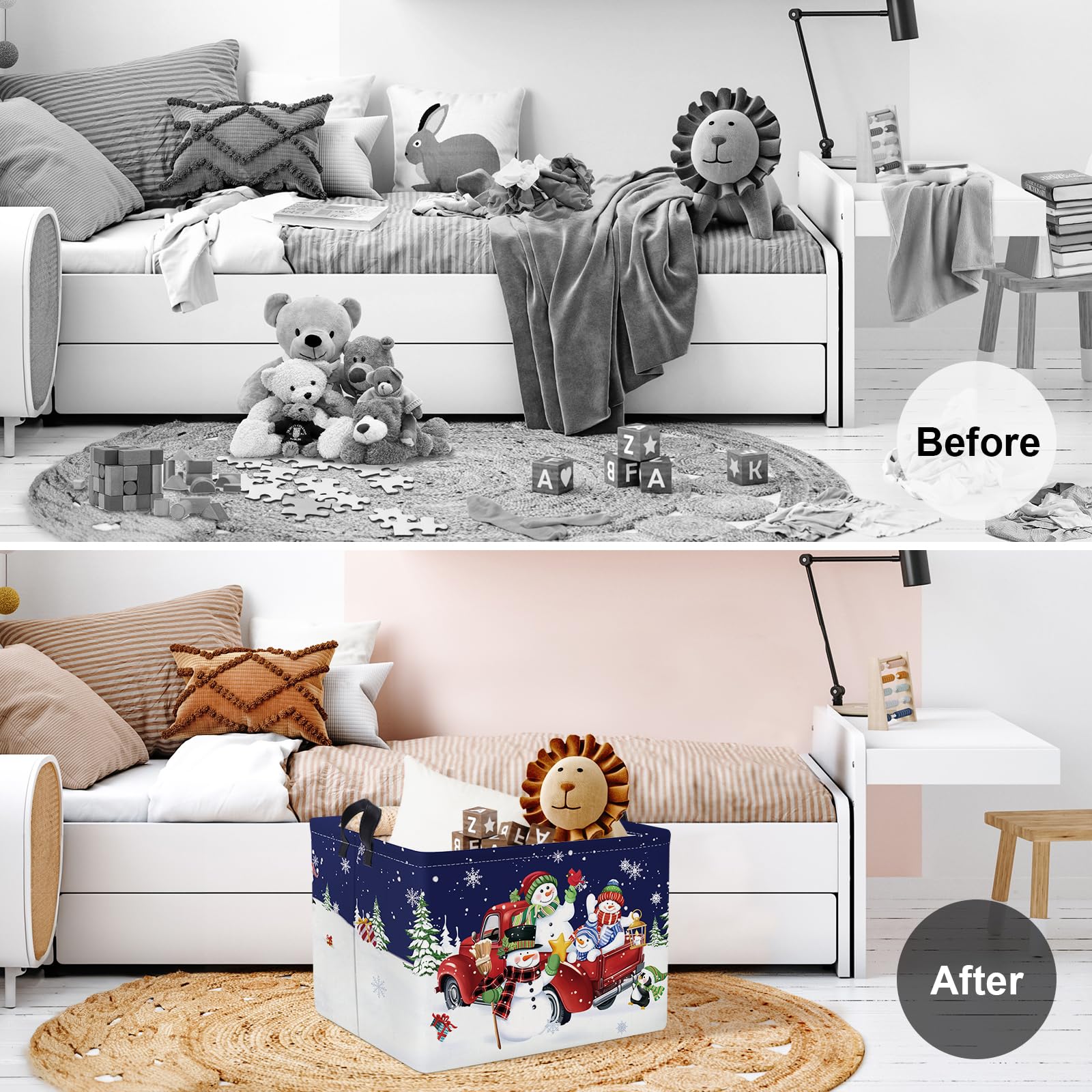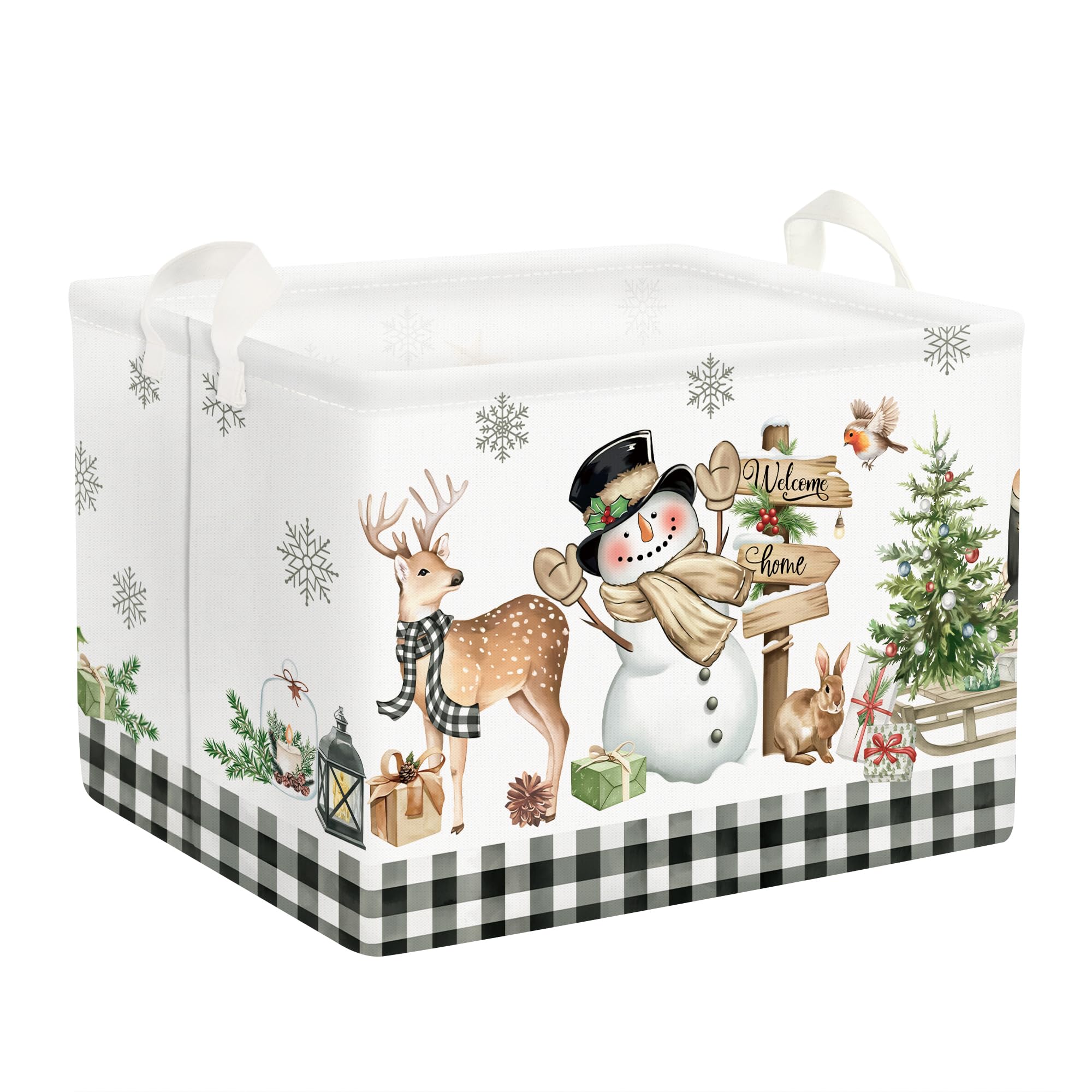 Christmas Snowman Basket: The warm moon shining on the penguins playing in the snow, the Santa preparing gifts, snowman smile, brings a strong Christmas atmosphere, which is nice and funny
