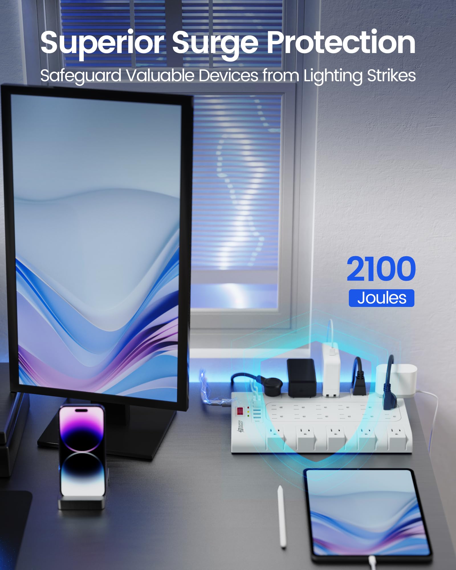 【Superior Surge Protection】 Composed of 3 level complementary surge protector circuit, including TVS, MOV, GDT, the surge protector flat plug has a 2100-Joule energy rating providing a reliable power extension cord to protect your devices. It secures your electronic units from power spikes, lightning strikes, or fluctuations.