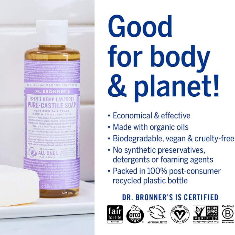 MADE WITH ORGANIC OILS & CERTIFIED FAIR TRADE INGREDIENTS: Dr. Bronner's Pure-Castile Magic Soap are made with over 70% certified organic & fair trade ingredients—an ethical, sustainable choice and a gentle pure castile soap for all!