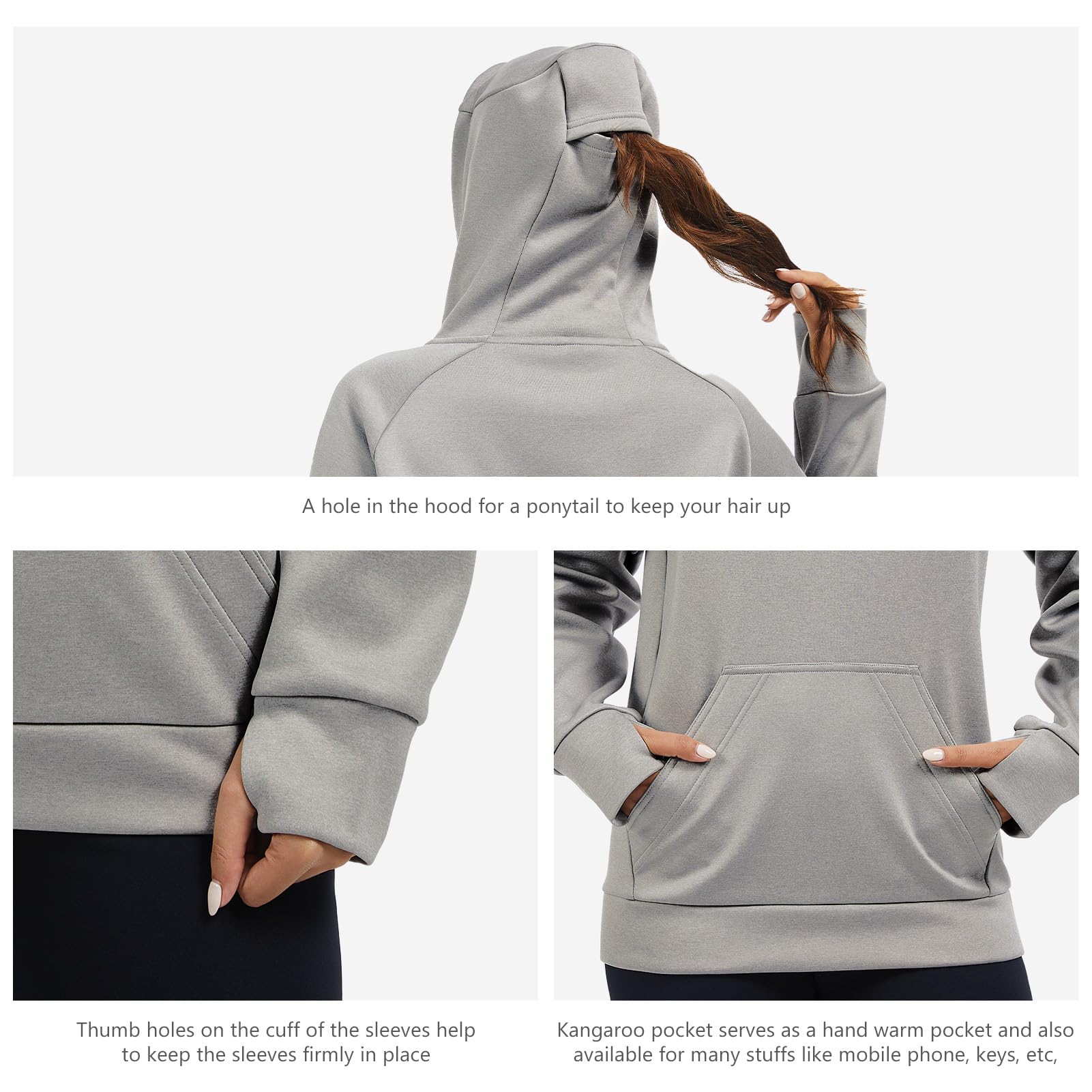 The front kangaroo pocket that serves as a hand warm pocket and is also available for some essentials; Thumb holes on the sleeve cuffs help to keep the sleeves firmly in place