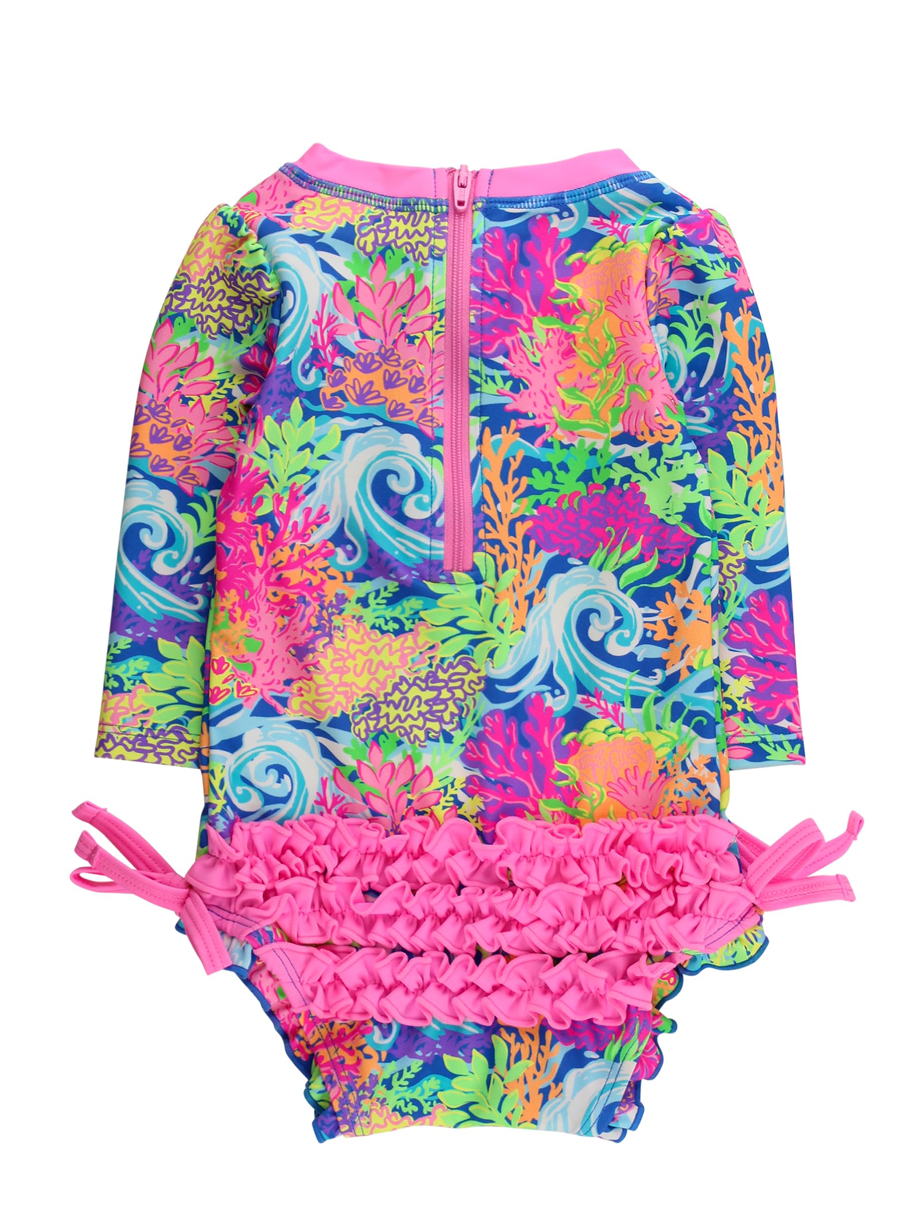 Bow detail,Full seat coverage,Long sleeves for sun protection,Quarter zipper,Ruffle detail,Signature rear ruffles,Snaps for easy changing