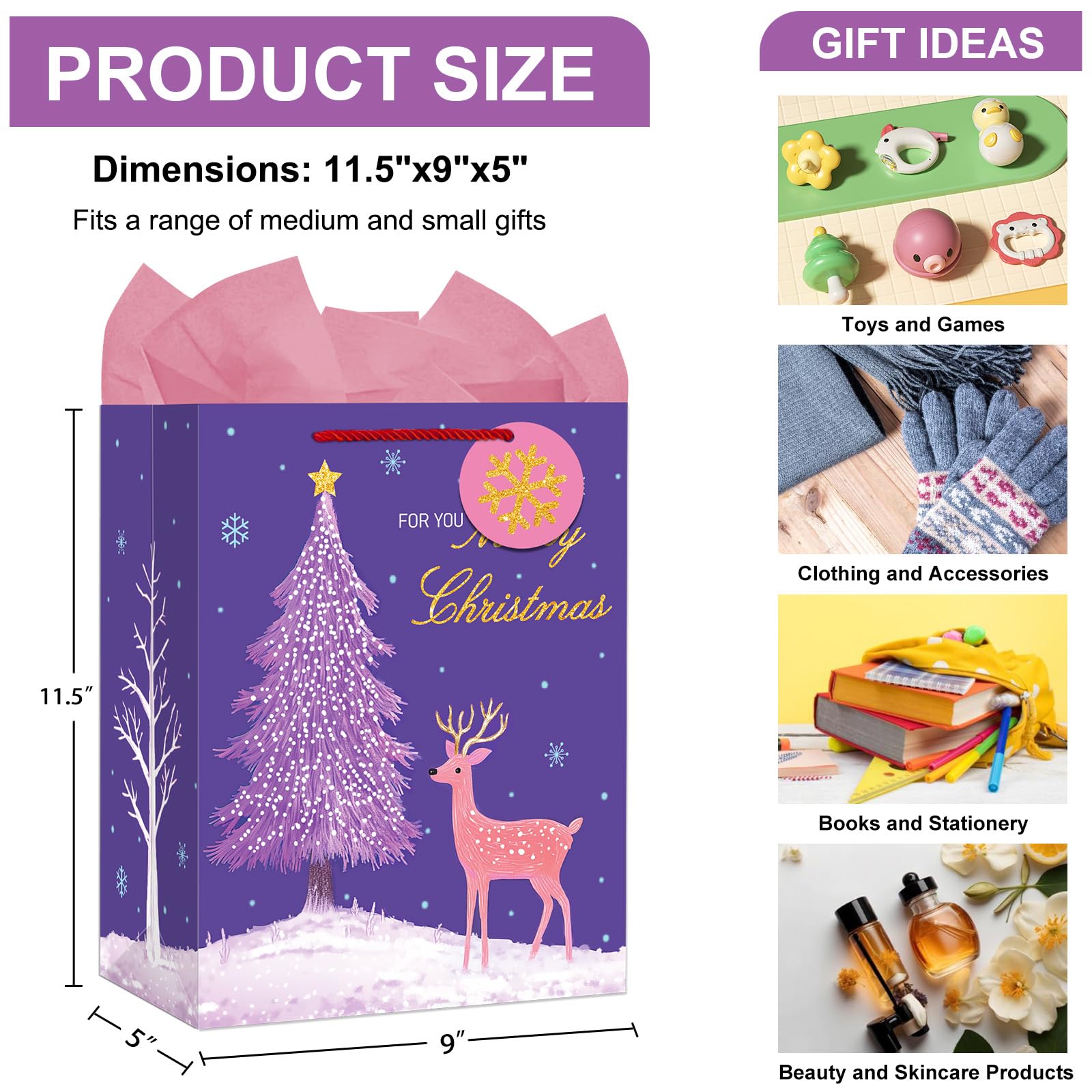 【Simplify Your Gift-Wrapping】: The Christmas gift bags come with handles, tissue paper, a gift tag, and a greeting card, making your holiday gift-wrapping quick and effortless.Each Christmas bag size 11.5"x9"x5",fits a range of medium and small gifts.