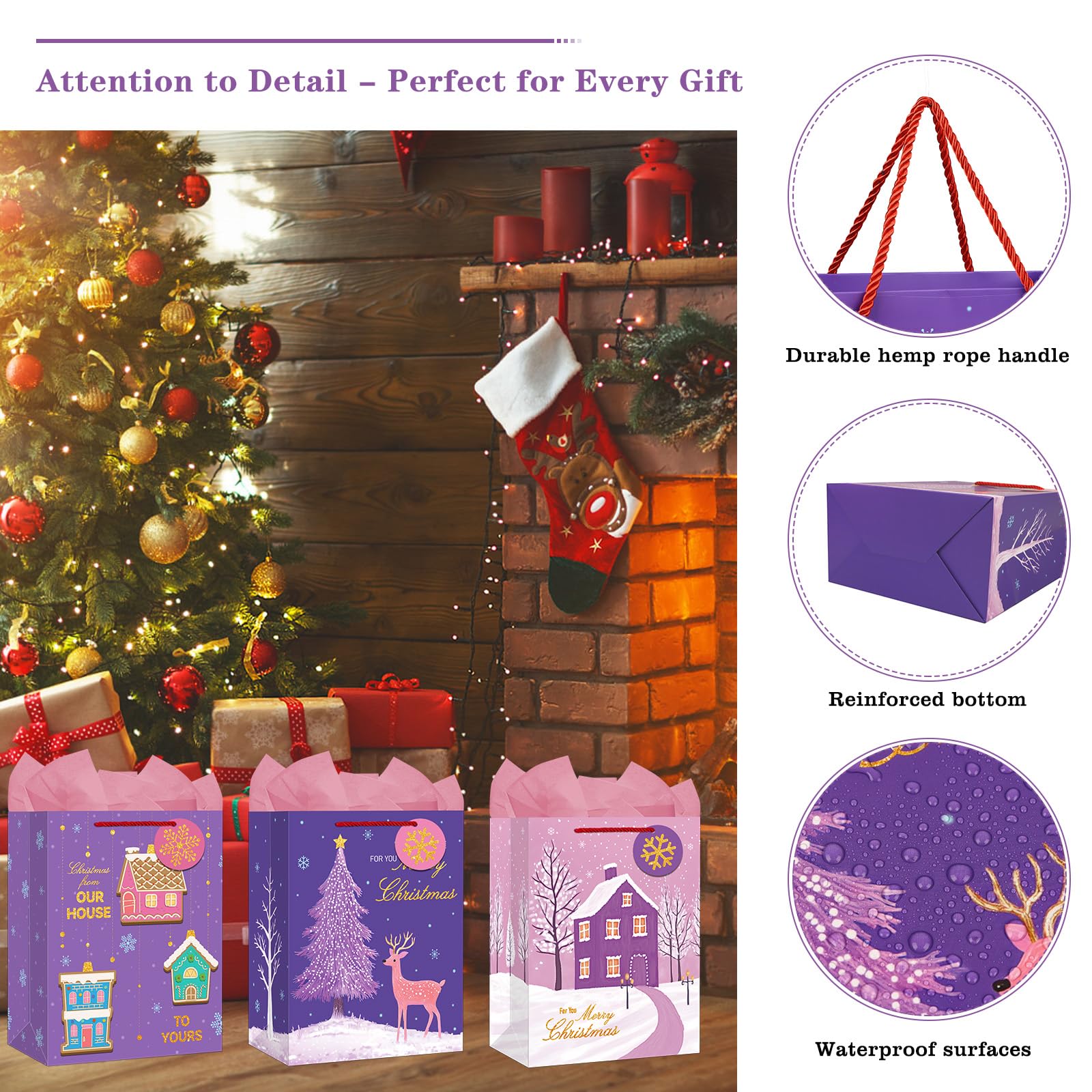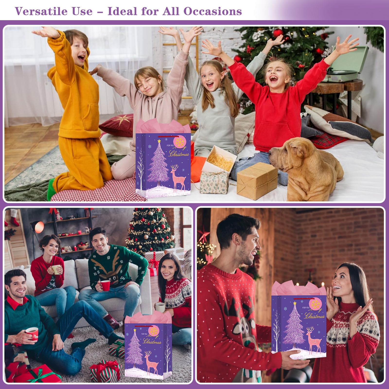 【Ensure Durability and Reusability】: Made from high-quality paper, these Christmas gift bags are sturdy and reusable, ensuring they can hold a variety of presents and be used for multiple occasions.