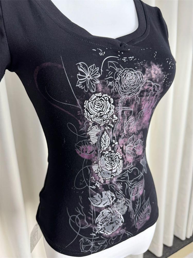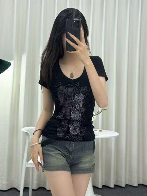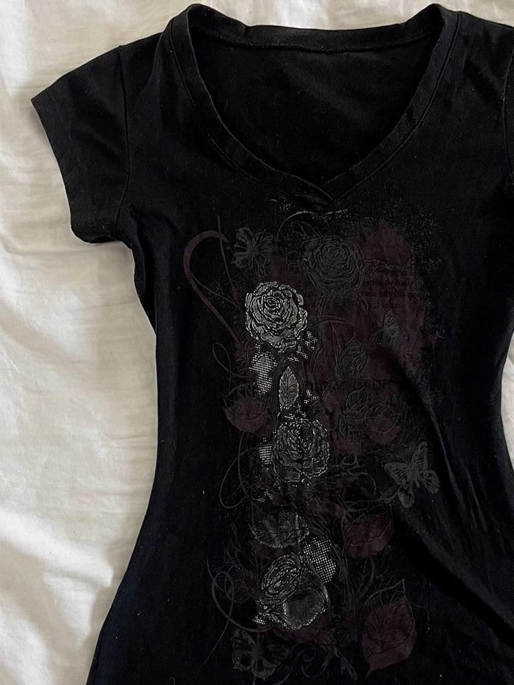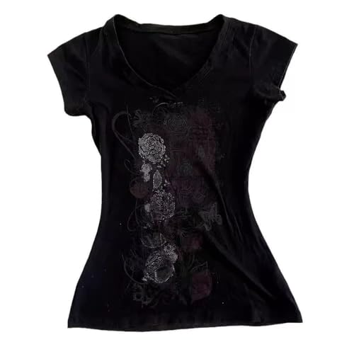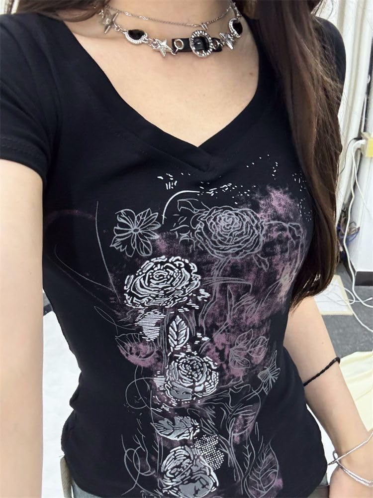 Embrace the Y2K aesthetic with our Women's Gothic V-Neck T-Shirt, featuring a slim fit design for a trendy look.