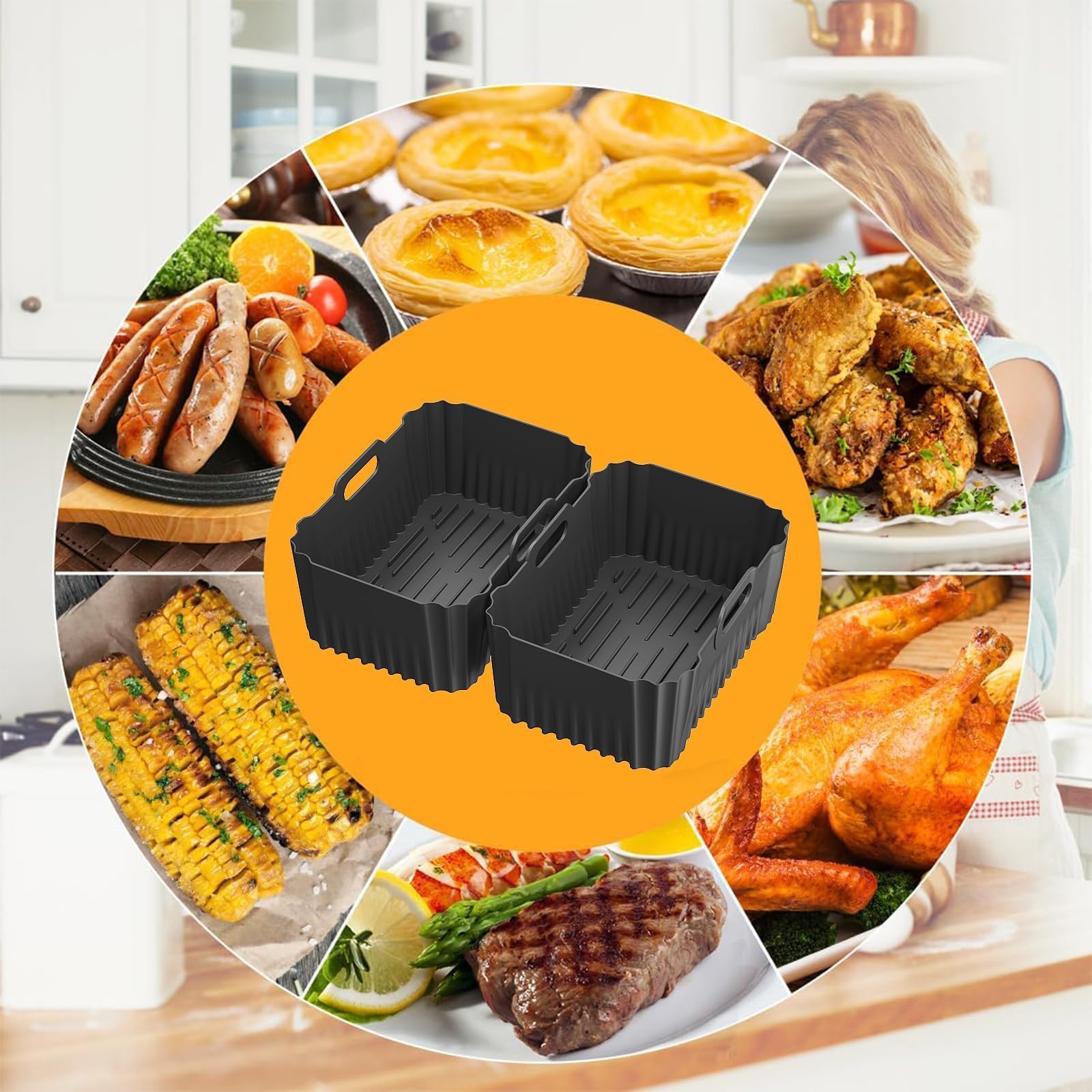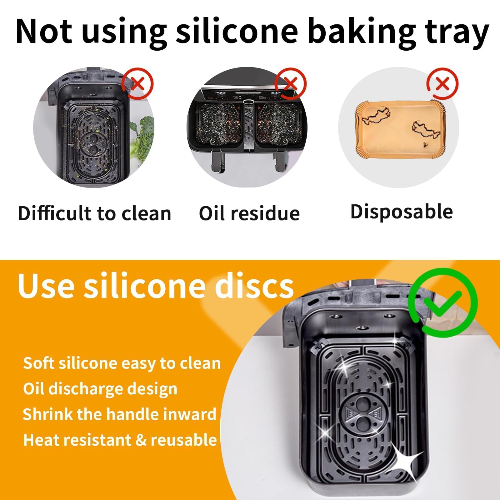 Custom Design -The custom-tailored silicone air fryer liners fit ninja dual air fryer 2 basket 10 QT seamlessly. The bottom of the silicone air fryer liners with raised lines allow airflow well and separate food from oil produced during cooking.The thickened silicone wall ensure the silicone liners hold its shape fully.