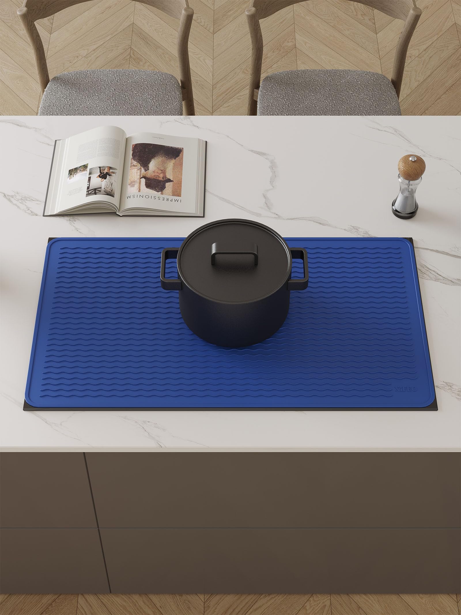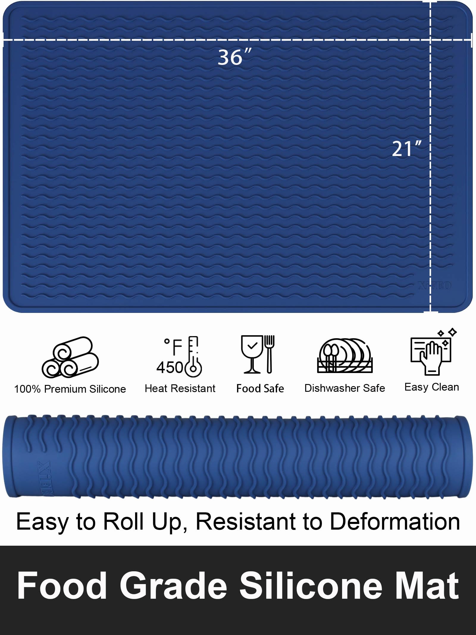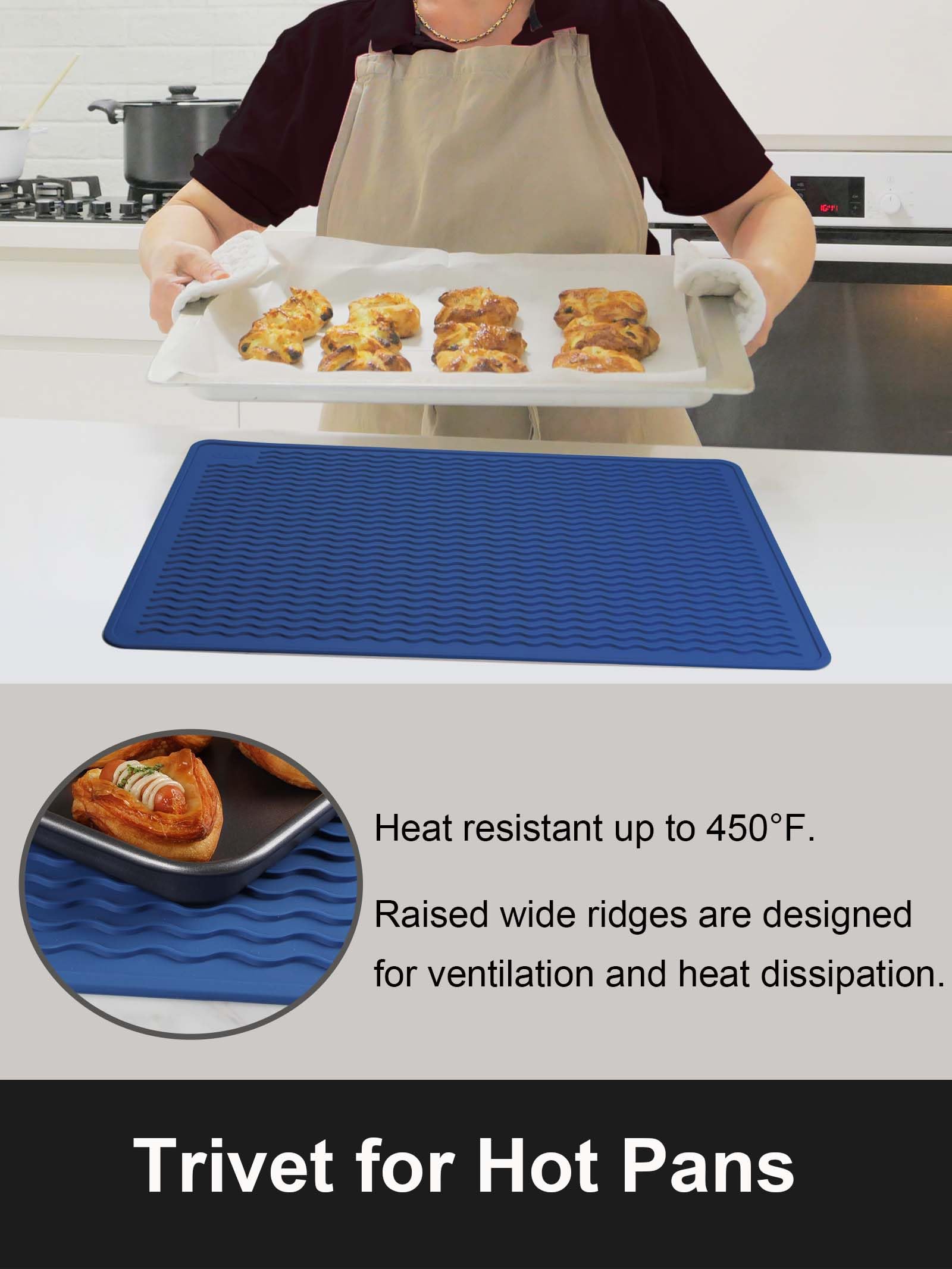 [Silicone Trivet Mat] Elevated wave patterns ensure efficient heat dissipation, while our silicone mat withstands temperatures up to 450°F, safeguarding your surfaces from heat damage. Caution: Do not cover induction cookers exceeding 450°F or place over active cookers.