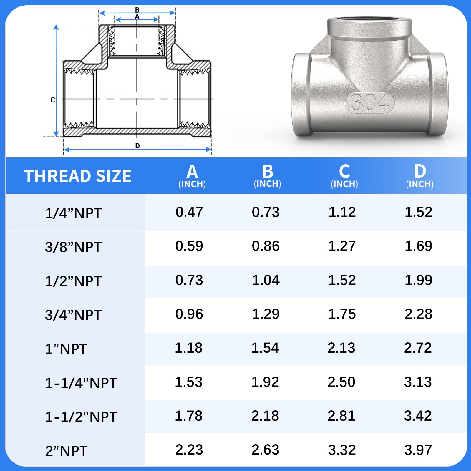 SIZE - 1" x 1" x 1" NPT Female Tee Fitting. Note, NPT thread is the nominal pipe size and does not represent the actual diameter, please refer to the dimension drawing for specific diameter.