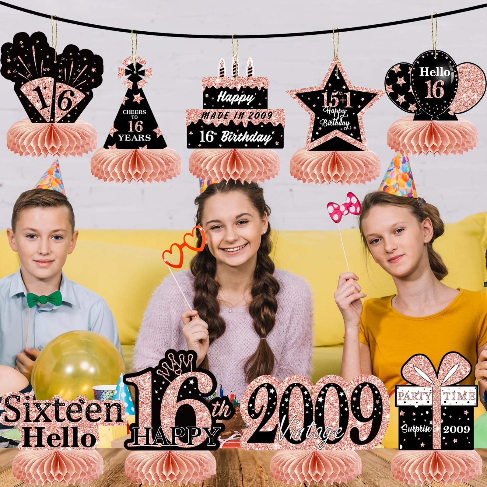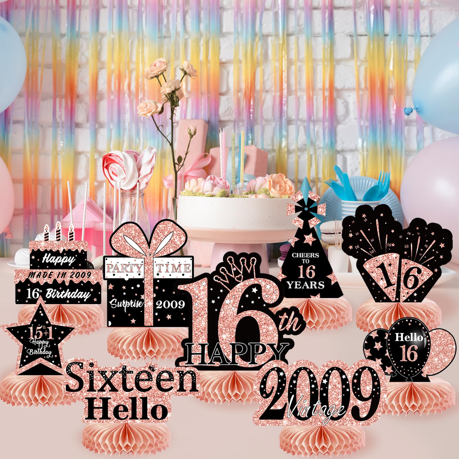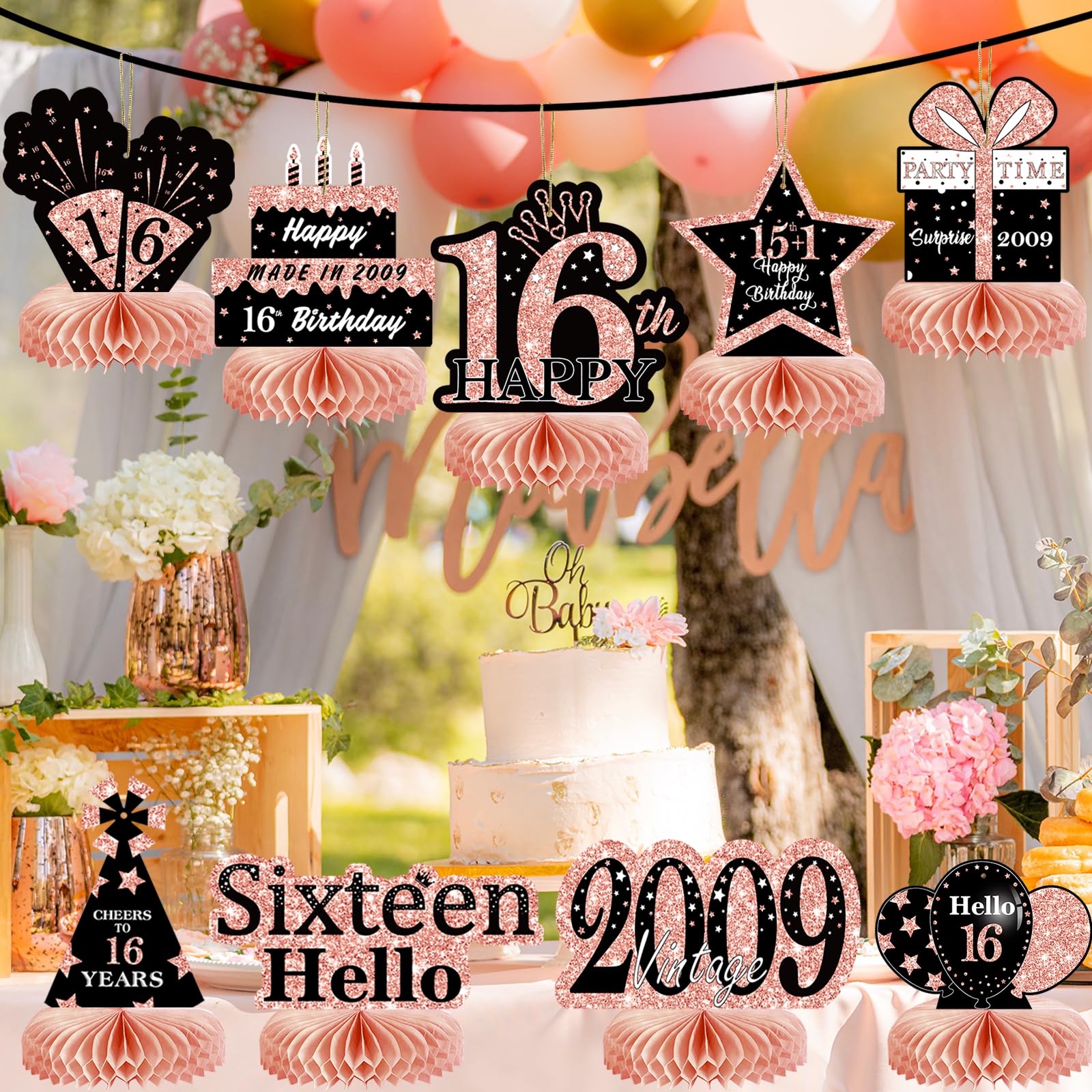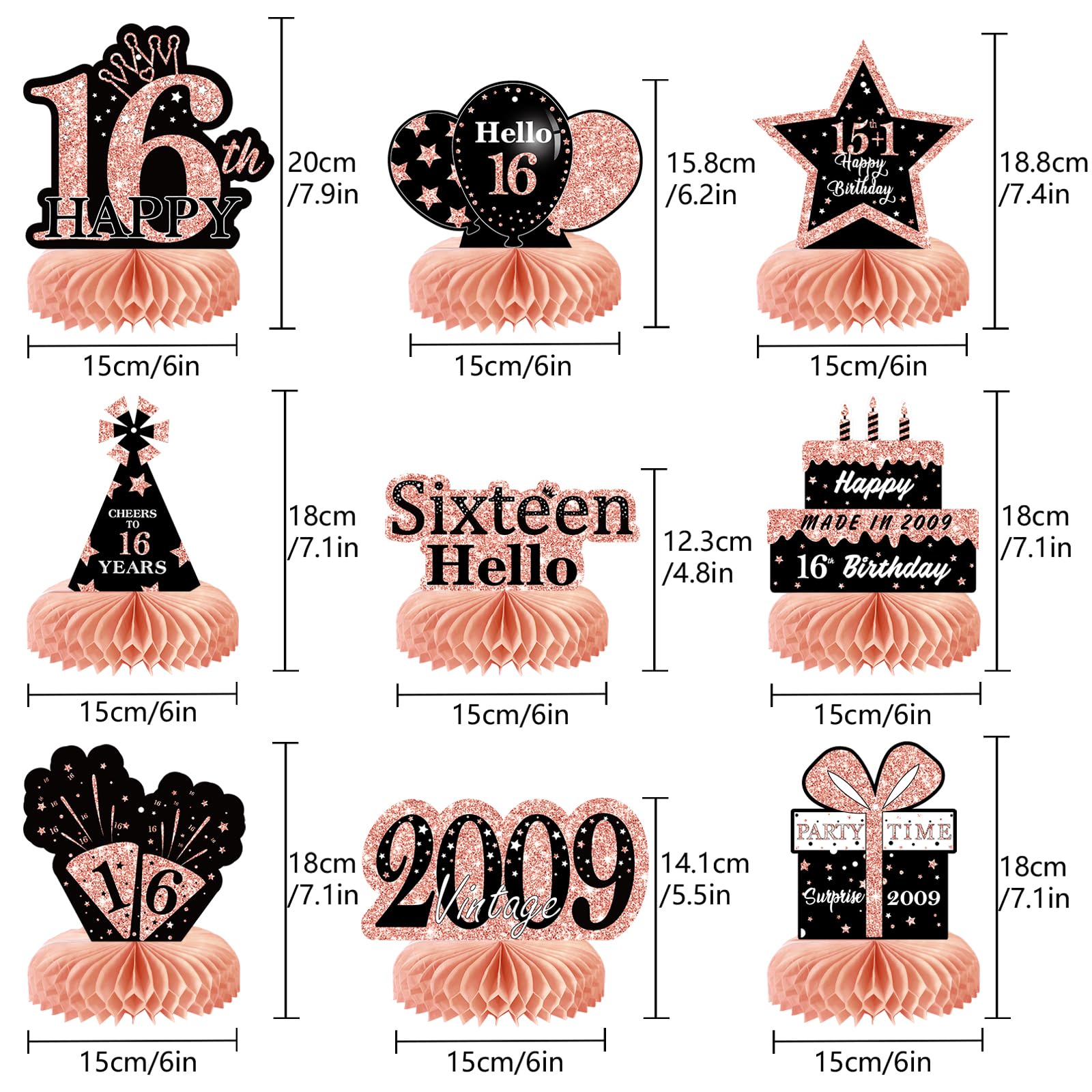 [You Will Get]- 9 pcs rose gold sweet 16 birthday decorations honeycomb table centerpieces for girls, it contains 9 patterned cardboards and 9 paper honeycombs,and matching lanyards.These chic 16th birthday table decorations are enough to decorate your themed party.