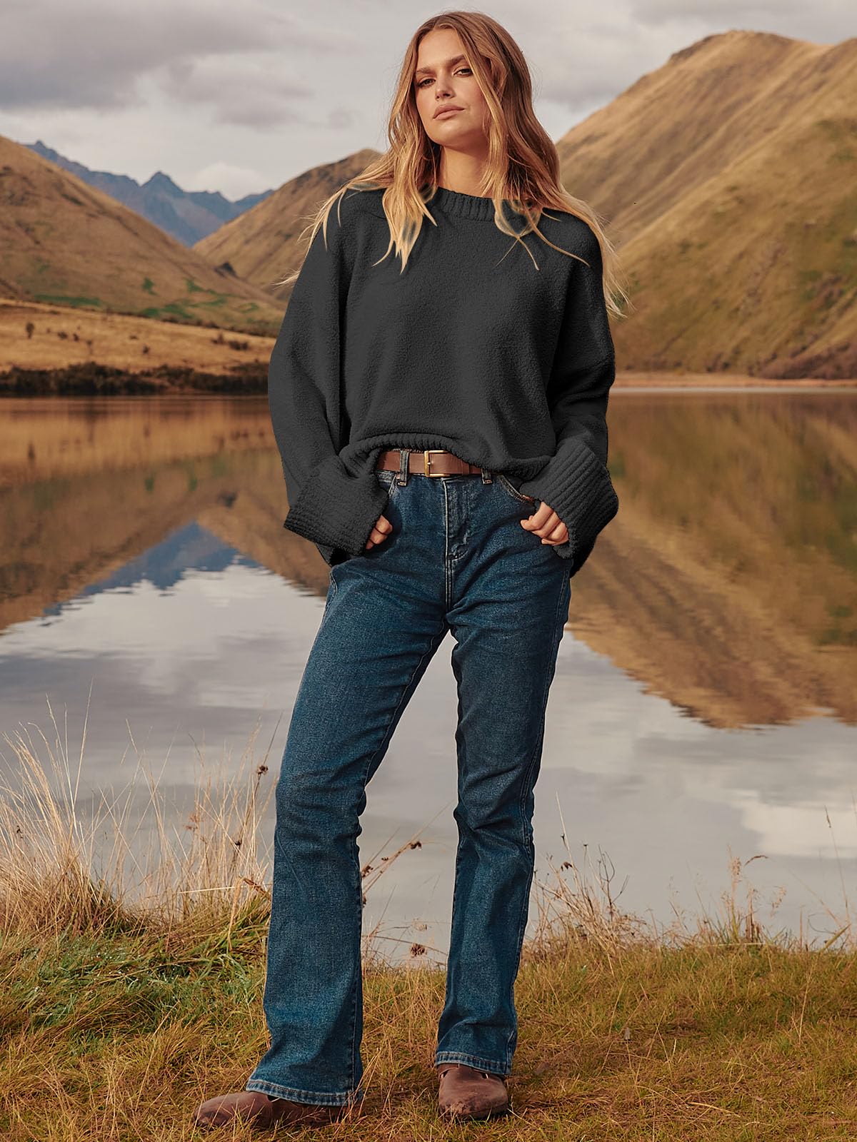 Design - crew neck, long sleeve, ribbed cuff, solid color, oversized style, fuzzy knit sweater.