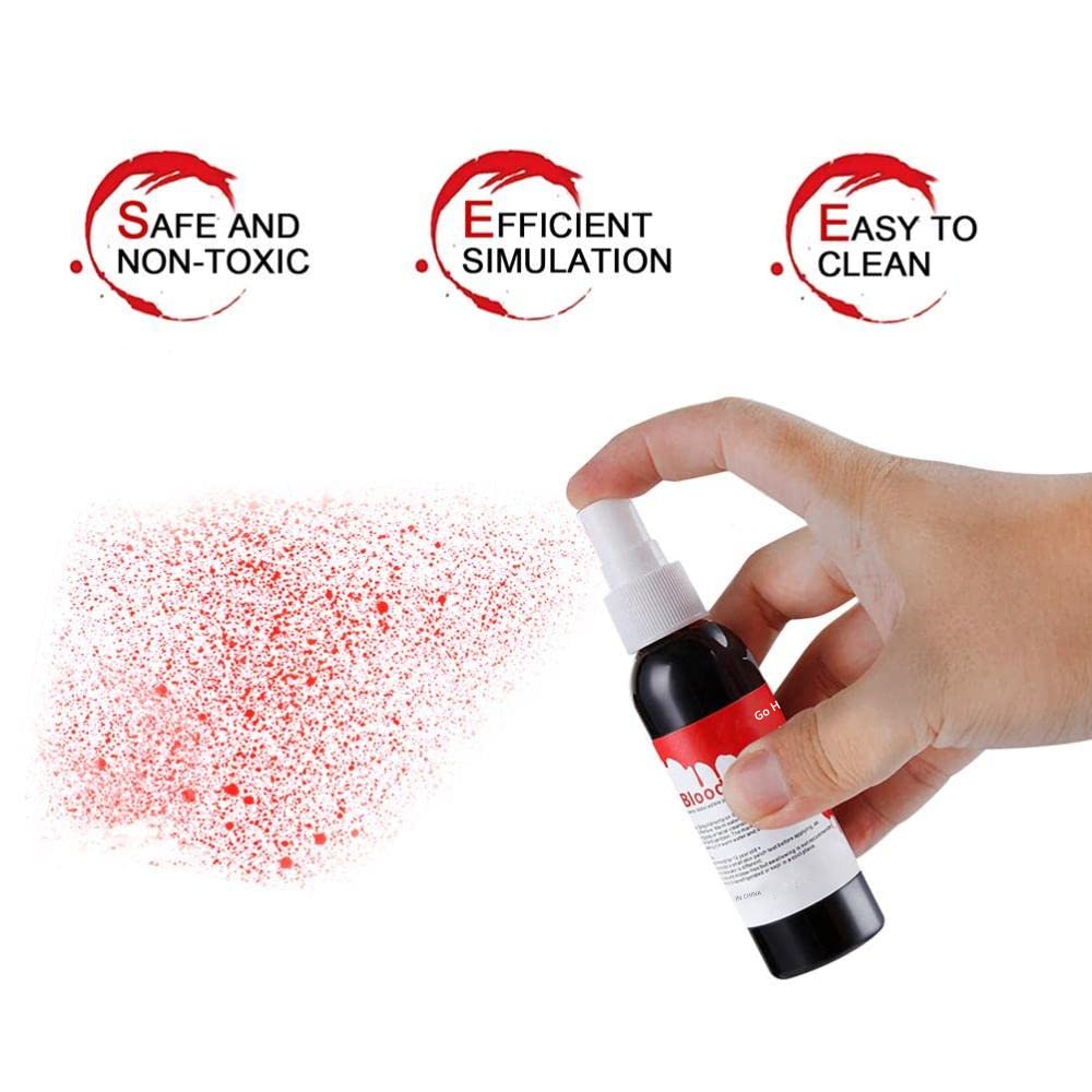 【Easy to Use and Washable】Realistic Fake Blood for Horror Scenes,such as movie show.Spray it directly on the area you need.It will run like real blood,and take a while to dry.It is washable by soap. Wipe off with a tissue or absorbent cotton, then use Makeup Remover Soap easily clean it in warm water.NOTE:The bottle has a detailed use explanation and precautions, please read before use.